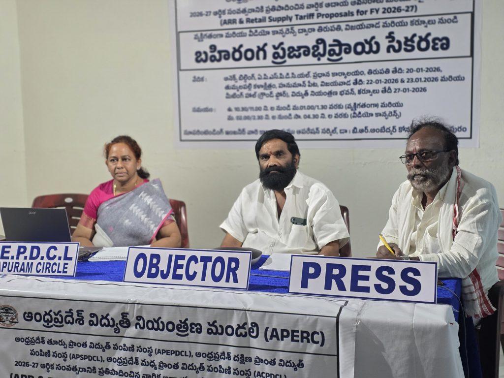అమలాపురంలో 2026-27 ఆర్థిక సంవత్సరానికి సంబంధించిన విద్యుత్ చార్జీల ప్రతిపాదనలపై ఏపీఈఆర్సీ (APERC) ఆధ్వర్యంలో మంగళవారం బహిరంగ ప్రజాభిప్రాయ సేకరణ జరిగింది. ముఖ్య విశేషాలు: