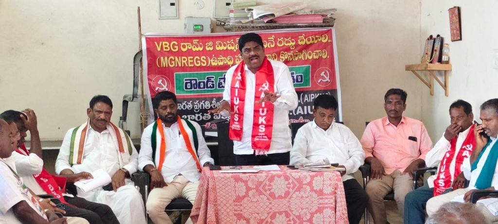 పయనించే సూర్యుడు నిజామాబాద్ జిల్లా స్టాపర్ టీకే గంగాధర్ విబిజీ రామ్ జీ మిషన్ వెంటనే రద్దు చేసి ఎం.జి.ఎన్.ఆర్.ఇ.జీ.ఎస్ ఉపాధి హామీ చట్టాన్ని కొనసాగించాలి-.అఖిల భారత ఐక్యరైతు సంఘం (ఎ.ఐ.యు.కె.ఎస్.), అఖిలభారత ప్రగతిశీల వ్యవసాయ కార్మికసంఘం (ఏఐపికెఎంఎస్) సంఘాల రౌండ్ టేబుల్ సమావేశంలో వక్తల స్పష్టికరణ.కార్పొరేట్ శక్తుల సేవా కోసమే కేంద్ర ప్రభుత్వం కూలీల పొట్ట గొడుతున్నదని, అందులో భాగంగానే ఉపాధిహామీనీ ఎత్తేసే కుట్రలకు పునుకుంటున్నదని అఖిలభారత ఐక్యరైతు సంఘం (ఎ.ఐ.యు.కె.ఎస్.) రాష్ట్ర కార్యదర్శి వి