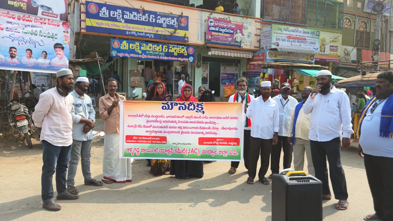 ఆళ్లగడ్డ నియోజకవర్గంలో ఈరోజు ప్రపంచవ్యాప్తంగా మైనారిటీలపై జరుగుతున్న దాడులకు నిరసనగా,ఆళ్లగడ్డ నాలుగు రోడ్ల కుడలిలో జేఏసీ కమిటీ కన్వీనర్ బీరువాల భాష మాట్లాడుతూ వారితోపాటు సామాజిక, రాజకీయ, సంఘాలా ఆధ్వర్యంలో,నాలుగు రోడ్ల కుడలిలో మౌన దీక్ష నిర్వహించారు.భారత్,బంగ్లాదేశ్లలో మైనార్టీలపై హింసను ఖండిస్తూ, న్యాయవ్యవస్థలో సంస్కరణలు, మైనార్టీల రక్షణకు ప్రత్యేక చట్టం తీసుకురావాలని కేంద్ర ప్రభుత్వాన్ని,రాష్ట్ర ప్రభుత్వాన్ని డిమాండ్ చేశారు.శాంతి సమాన హక్కుల కోసం ఐక్యంగా పోరాడుతామని ప్రజా సంఘాలు కులసంఘాలు తెలిపారు.ఈ కార్యక్రమంలో మాల మహానాడు నాయకుడు జిల్లా ఇన్చార్జి చంద్రశేఖర్,నంద్యాల జిల్లా జనరల్ సెక్రెటరీ ఎర్రమల చక్రవర్తి, మండల ఉపాధ్యక్షుడు బద్రి ప్రసాద్, ఎస్.డి. పి.ఐ పార్టీ నాయకుడు ఫక్రుద్దీన్, సిరివెళ్ల జేఏసీ నాయకుడు నిజాముద్దీన్, నూర్ భాషా, ఆళ్లగడ్డ జేఏసీ నాయకుడు బైక్ మెకానిక్ నూర్ భాషా, దస్తగిరి ఆళ్లగడ్డ కన్వీనర్ మూల ప్రభాకర్ వీరితోపాటు అధిక సంఖ్యలో మహిళలు కూడా పాల్గొన్నారు.