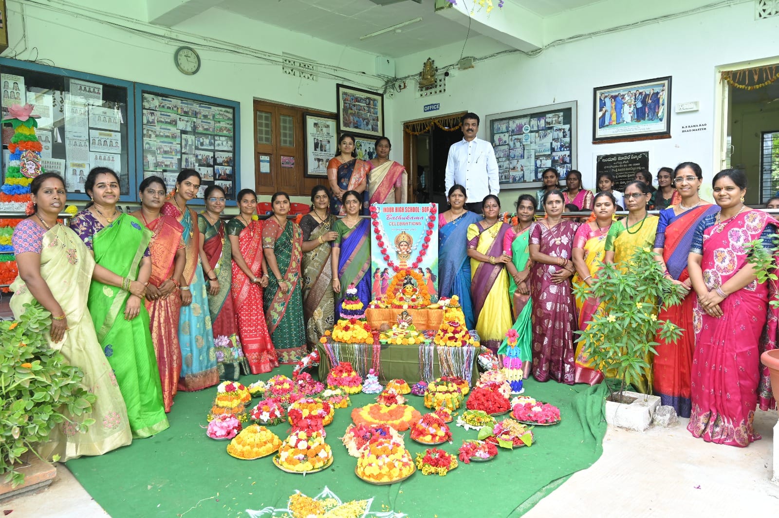 పయనించే సూర్యుడు న్యూస్ సెప్టెంబర్ 21 నిజామాబాద్ జిల్లా బోధన్ పట్టణంలోని ఇందుర్ హైస్కూల్లో శనివారం జరుపుకున్న బతుకమ్మ సంబరాలు అంబరాన్ని ఉంటాయి ఈ కార్యక్రమానికి ముఖ్య అతిథిగా విచ్చేసిన బోధన్ మండల విద్యాశాఖ అధికారి నాగయ్య మాట్లాడుతూ తెలంగాణ రాష్ట్ర సాంస్కృతిని సాంప్రదాయాన్ని భావితరాలకి అందించడం గొప్ప విషయమని మన ఆచార వ్యవహారాలను ఈ సంబరాలను పాఠశాల యజమాన్యం నిర్వహించిందని అన్నారు. పాఠశాల కరస్పాండెంట్ కొడాలి కిషోర్ మాట్లాడుతూ తమ పాఠశాలలో ప్రతి ఏటా క్రమం తప్పకుండా బతుకమ్మ సంబరాలను ఘనంగా నిర్వహిస్తామని పిల్లలకు పండగ యొక్క విశిష్టతను తెలియపరిచే బాధ్యత ఉందని వివరించారు. మహిళా ఉపాధ్యాయురాలు విద్యార్థినిలు తెలుగు సాంప్రదాయాల ఉట్టిపడేలా చీరలు పూలు ధరించి ఆకర్షణీయంగా నిలిచారు తెలుగు సాంప్రదాయలను మైమరిపించే విధంగా రంగురంగుల పువ్వులు కాగితాలతో బతుకమ్మలను పేరించారు బతుకమ్మలకు సాంస్కృతిక సాంప్రదాయాలను అనుసరిస్తూ పూజలు నిర్వహించారు బతుకమ్మలను పాఠశాల ఆవరణంలో ఉంచి రకరకాల బతుకమ్మలు పాటలు పాడుతూ నృత్యాలు చేస్తూ అలరించారు తెలంగాణ సాంస్కృతి సంప్రదాయాలకు చిరునామాగా నిలిచే బతుకమ్మ ఉత్సవాలు ఇందూర్ హైస్కూల్లో అంబరాన్ని అంటాయి. ఈ కార్యక్రమంలో పాఠశాల ప్రధానోపాధ్యాయులు ఎస్,రామారావు, పాఠశాల అడ్మినిట్రేటివ్ ఇంచార్జ్ స్వాతి, ఉపాధ్యాయురాలు విద్యార్థినులు తదితరులు పాల్గొన్నారు