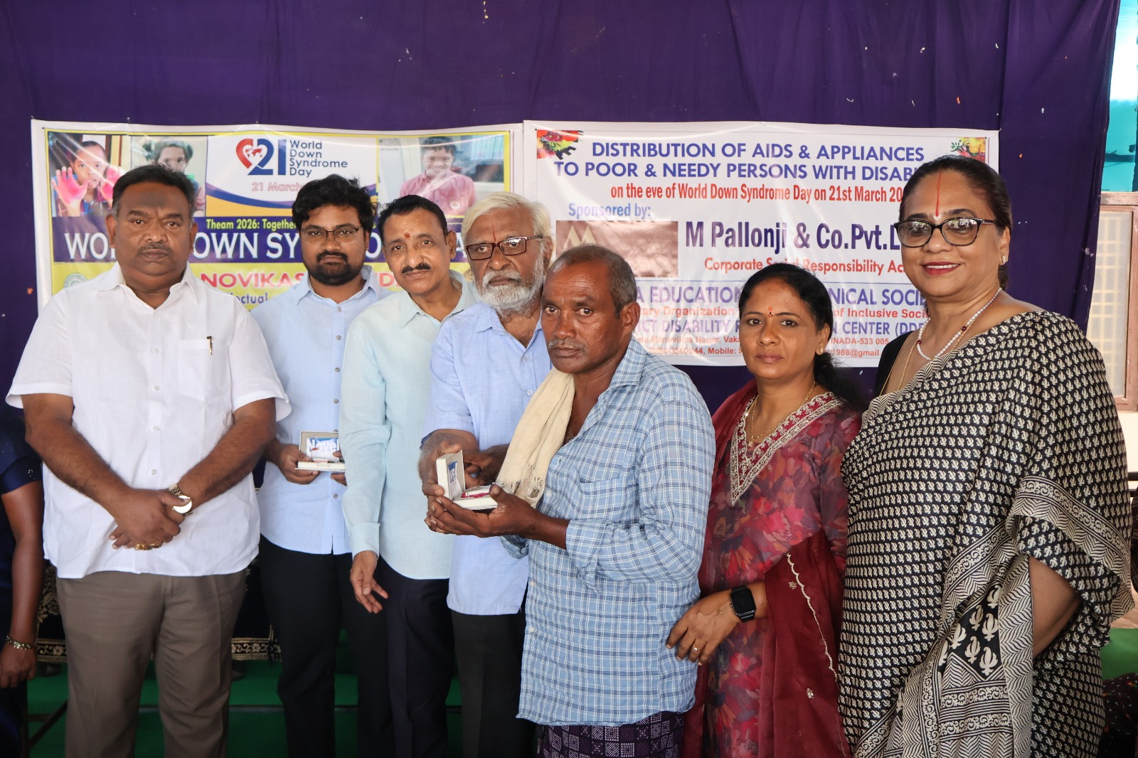 పయనించే సూర్యుడు మార్చి 20 ముమ్మిడివరం ప్రతినిధి కాకినాడ (వాకలపూడి): స్థానిక వాకలపూడి పంచాయతీలోని ఉమా ఎడ్యుకేషనల్ అండ్ టెక్నికల్ సొసైటీ కార్యాలయంలో ఈ రోజు "ప్రపంచ డౌన్ సిండ్రోమ్ దినోత్సవం" వేడుకలను ఘనంగా నిర్వహించారు. ఈ సందర్భంగా ముంబైకి చెందిన "ఎమ్. పల్లోంజి గ్రూప్ ఆఫ్ కంపెనీస్ ప్రైవేట్ లిమిటెడ్" వారి ఆర్థిక సహకారంతో, సుమారు రూ. 2,50,000 (రెండు లక్షల యాభై వేల రూపాయల) విలువైన కృత్రిమ పరికరాలను దివ్యాంగులకు ఉచితంగా పంపిణీ చేశారు.ఈ కార్యక్రమంలో సంస్థ కార్యనిర్వాహక వర్గ సభ్యులు (Board of Directors) శ్రీ ఎస్.పి. రెడ్డి (ఎగ్జిక్యూటివ్ డైరెక్టర్), శ్రీ పి. కనకరాజు గారు , డాక్టర్ డి. విజయలక్ష్మి గారు , శ్రీ ఎన్. వెంకటేశ్వర్లు గారు , శ్రీ కె. సత్యనారాయణ గారు , మరియు శ్రీమతి ఎస్. మహాలక్ష్మి గారు పాల్గొని పంపిణీని ప్రారంభించారు.ఈ సందర్భంగా బోర్డు సభ్యులు మాట్లాడుతూ.. డౌన్ సిండ్రోమ్ ఉన్న పిల్లల పట్ల సమాజం సానుకూల దృక్పథంతో ఉండాలని, వారికి సరైన శిక్షణ, ప్రోత్సాహం అందిస్తే అద్భుతాలు సాధిస్తారని పేర్కొన్నారు. ఎమ్. పల్లోంజి గ్రూప్ వారి తోడ్పాటుతో సుమారు 60 మంది లబ్ధిదారులకు మూడు చక్రాల సైకిళ్లు, కృత్రిమ కాళ్లు, కాలిపర్స్, వీల్ చైర్లు, కళ్లజోళ్లు మరియు వినికిడి యంత్రాలను అందజేయడం సంతోషంగా ఉందన్నారు.అనంతరం సంస్థ ఎగ్జిక్యూటివ్ డైరెక్టర్ శ్రీ ఎస్.పి. రెడ్డి మాట్లాడుతూ.. సంస్థ కార్యనిర్వాహక సభ్యుల సమష్టి కృషి మరియు దాతల సహకారం వల్లే ఇంతటి భారీ వ్యయంతో కూడిన పరికరాలను ఉచితంగా అందించగలుగుతున్నామని తెలిపారు. ఈ సందర్భంగా లబ్ధిదారులందరికీ ఆయన తెలుగు నూతన సంవత్సర శుభాకాంక్షలు తెలియజేశారు.ఈ కార్యక్రమంలో ప్రాజెక్ట్ డైరెక్టర్ శ్రీ కె. నారాయణ రెడ్డి, జాయింట్ డైరెక్టర్ శ్రీ ఎస్.వి.ఎస్.ఎన్. రెడ్డి, శ్రీమతి ఎస్. ఉమారెడ్డి, జిల్లా దివ్యాంగుల పునరావాస కేంద్రం సిబ్బంది, ప్రత్యేక విద్యా శిక్షకులు, ట్రైనీ విద్యార్థులు, లబ్ధిదారులు మరియు వారి తల్లిదండ్రులు పాల్గొని కార్యక్రమాన్ని విజయవంతం చేశారు.(ఎస్.పి. రెడ్డి)ఎగ్జిక్యూటివ్ డైరెక్టర్