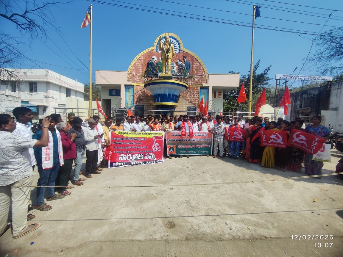 కార్మిక, రైతు, ప్రజలను కార్పొరేట్ లకు దోచిపెట్టడం మానుకోవాలని అఖిల భారత రైతు కూలీ సంఘంరాష్ట్ర ఉపాధ్యక్షులు జే.రాజు,, టి యు సి ఐ జిల్లా అధ్యక్ష కార్యదర్శులు ఏం బక్కన్న రామ్ లక్ష్మణ్ ఐ ఎఫ్ టి యు జిల్లా కార్యదర్శి ఎం హరిత ఏఐకేఎస్ జిల్లా అధ్యక్షులు ఇప్ప లక్ష్మణ్ లు హెచ్చరించారు. గురువారం సంయుక్త కిసాన్ మోర్చా, సి టి యు ల ఆధ్వర్యంలో భైంసా పట్టణంలోని అంబేద్కర్ విగ్రహం వద్ద జరిగిన సార్వత్రిక సమ్మె సభలో వారు మాట్లాడుతూ మోడీ ప్రభుత్వం కార్మిక కర్షక వ్యతిరేకంగా చట్టాలు రూపొందిస్తున్నదని అనేక సంవత్సరాల పోరాటాల ఫలితంగా సాధించుకున్న హక్కులను కాలరాస్తూ నాలుగు లేబర్ కోడ్ లను తెస్తున్నదని విమర్శించారు కార్మికుల జీతభత్యాలు తక్కువగా ఉండి తీవ్రమైన ఇబ్బందులు పడుతున్న ప్రస్తుత పరిస్థితిలో కోడ్ ల రూపంలో దోపిడీ పెంచుతున్నారని విమర్శించారు వ్యవసాయ రంగాన్ని వ్యాపారాన్ని కార్పోరేట్ కంపెనీలకు అప్పచెప్పే కుట్రలో భాగంగా విత్తన చట్టం విద్యుత్ చట్టం తెస్తున్నదని అన్నారు అమెరికా తో చేసుకున్న ఒప్పందాలు భారత చిన్న సన్న కారు రైతాంగ వెన్ను విరుస్తాయని ఇది మోడీ తన ఫ్రెండు అయినా ట్రంప్ కు ఇస్తున్న బహుమతి అని విమర్శించారు వ్యవసాయ వాణిజ్యాన్ని బహుళ జాతి కంపెనీలకు ప్రవేశం కల్పిస్తూ రైతులను వ్యాపారులకు బలి పశువులుగా మారుస్తున్నారని అన్నారు కార్మిక కర్షక లోకం ఏకమై మోడీ ప్రభుత్వం పై పోరాటాన్ని కొనసాగిస్తారని హెచ్చరించారు. ఈ కార్యక్రమానికి పి డి ఎస్ యు జిల్లా అధ్యక్షుడు మహేందర్ మద్దతు తెలిపారు ఇంకా ఈ కార్యక్రమంలో ఏఐ కేఎంఎస్ జిల్లా నాయకులు గంగాధర్ దీనాజీ ఏఐకేఎస్ నాయకులు ము త్తన్న, (టి యు సి ఐ) నాయకులు గోదావరి, ఏఐటీయూసీ నాయకులు కార్మికులు దేవిదాస్, రాములు, శంకర్, అనురాధ, నరేష్, నరేందర్, మధుకర్, గంగాధర్, రమేష్, లింగన్న తదితరులు పాల్గొన్నారు.