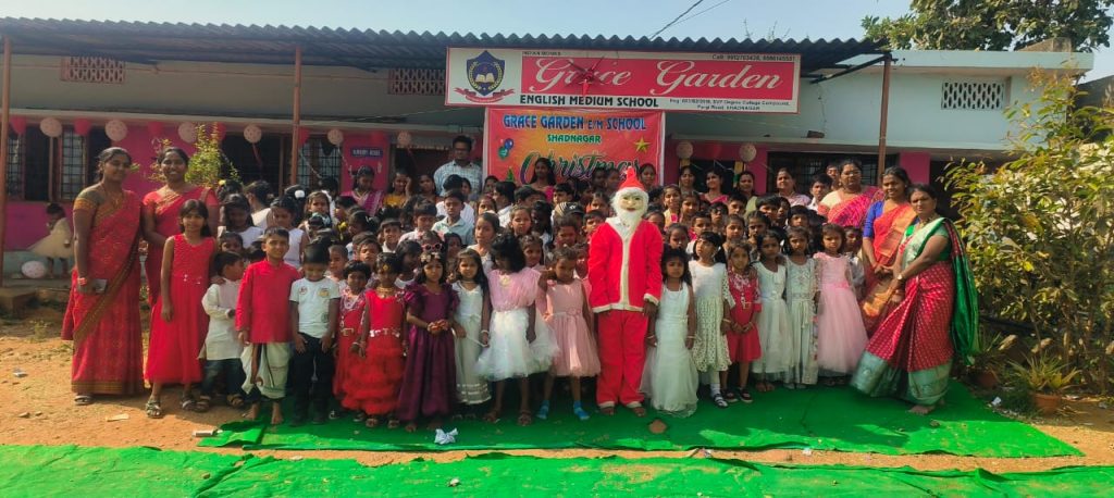 రంగారెడ్డి జిల్లా షాద్నగర్ పట్టణంలోని గ్రేస్ గార్డెన్ ఇంగ్లీష్ మీడియం స్కూల్లో క్రిస్మస్ వేడుకలను ఘనంగా నిర్వహించారు. విద్యార్థులు వేషధారణలతో మరియు ఆటపాటలతో అలరించారు. అనంతరం స్కూల్ ప్రిన్సిపాల్ ఆసీస్.. మాట్లాడుతూ విద్యార్థులకు క్రిస్మస్ యొక్క విశిష్టతను మరియు ప్రాముఖ్యతను విద్యార్థులకు వివరించడం జరిగింది. అనంతరం విద్యార్థులకు మరియు ఉపాధ్యాయుని ఉపాధ్యాయులకు బహుమతులను అందజేయడం జరిగింది. ఈ కార్యక్రమంలో విద్యార్థులతో పాటు పాఠశాల ఉపాధ్యాయుని ఉపాధ్యాయులు తదితరులు పాల్గొన్నారు.