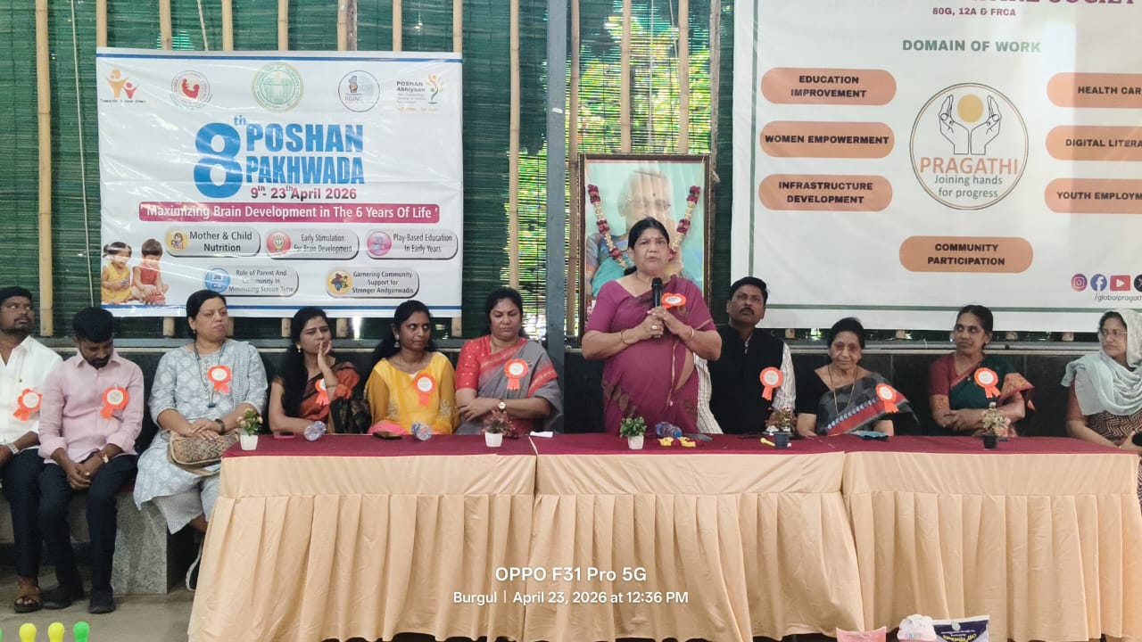 గ్రామీణ ప్రాంతాల్లో మహిళలు, చిన్నారుల ఆరోగ్యంపై అవగాహన కల్పించడమే లక్ష్యంగా ప్రగతి వెల్ఫేర్ సొసైటీ చేపట్టిన ‘ప్రగతి పోషణ మహోత్సవం’ ఉమ్మడి బుర్గుల గ్రామంలో గురువారం ఘనంగా నిర్వహించబడింది. ఈ కార్యక్రమానికి ప్రగతి వెల్ఫేర్ సొసైటీ అధ్యక్షులు డాక్టర్ ఆలొక్ అగర్వాల్ విశిష్ట అతిథిగా హాజరై జ్యోతి ప్రజ్వలన చేసి వేడుకలను ప్రారంభించారు. ఈ సందర్భంగా జరిగిన సభలో టీజీఎస్సీపీసీఆర్ సభ్యులు సీతా దయాకర్ రెడ్డి, జిల్లా మహిళా అభివృద్ధి అధికారి శ్రీలత మాట్లాడుతూ.. గర్భిణీలు, బాలింతలు సరైన పోషకాహారం తీసుకోవడం ద్వారానే ఆరోగ్యవంతమైన సమాజం సాధ్యమవుతుందని పేర్కొన్నారు. అనంతరం గ్రామానికి చెందిన 35 మంది గర్భిణీ స్త్రీలకు సొసైటీ ఆధ్వర్యంలో సాంప్రదాయబద్ధంగా సీమంతం నిర్వహించి, వారికి పండ్లు, పోషకాహార కిట్లను పంపిణీ చేశారు. అలాగే 35 మంది చిన్నారులకు అన్నప్రాశన, 50 మంది పిల్లలకు విద్యాభ్యాసం ప్రారంభోత్సవంగా అక్షరాభ్యాసం చేయించారు.0-6 సంవత్సరాల పిల్లల్లో పోషకాహార లోపం లేకుండా చూడాలని, అంగన్వాడీ సేవలపై అవగాహన పెంచుకోవాలని వక్తలు సూచించారు. జీరో మాల్న్యూట్రిషన్ హెడ్ డ్యాగ శంకర్ అధ్యక్షతన జరిగిన ఈ కార్యక్రమంలో బాలల హక్కుల కమిషన్ సభ్యులు ప్రేమలత అగర్వాల్, బండి అపర్ణ, వచన్ కుమార్, మాజీ సీడీపీవో షబ్నం, ప్రస్తుత సీడీపీవో ఉదయ, సర్పంచ్ రాజా గోపాల్ రెడ్డి, పంచాయతీ కార్యదర్శులు స్వప్న, వీరబద్రప్ప, జంగయ్య, డీఆర్డీఓ ఏపీవో అరుణ, యునైటెడ్ వే హైదరాబాద్ ప్రతినిధులు, ఆశా వర్కర్లు మరియు ఆంగన్వాడీ టీచర్లు పెద్ద ఎత్తున పాల్గొన్నారు. కార్యక్రమ విజయవంతానికి కృషి చేసిన కోఆర్డినేటర్ లావణ్య, మురళీ కృష్ణ, ప్రగతి వెల్ఫేర్ సొసైటీ సభ్యులను గ్రామస్తులు అభినందించారు.