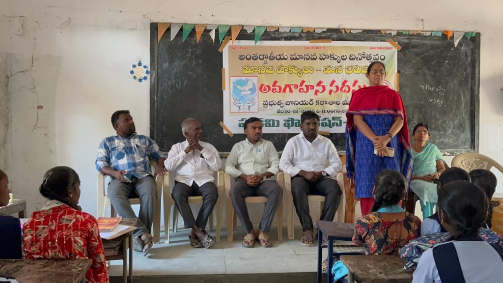 మక్తల్అంతర్జాతీయ మానవ హక్కుల దినోత్సవాన్ని పురస్కరించుకొని పుడమి ఫౌండేషన్ ఆధ్వర్యంలో స్థానిక ప్రభుత్వ జూనియర్ కళాశాలలో *”మానవ హక్కులు – మన భవిష్యత్తు”* అనే అంశంపై అవగాహన సదస్సు నిర్వహించడం జరిగింది. ఈ అవగాహన సదస్సుకు పుడమి ఫౌండేషన్ అధ్యక్షులు *వెంకటపతి రాజు అధ్యక్షత వహించి మాట్లాడుతూ* పుడమి ఫౌండేషన్ రాజ్యాంగపు హక్కులను ప్రచారం చేయడంతో పాటు పర్యావరణాన్ని కాపాడుకోవడం ప్రధాన లక్ష్యంగా పనిచేస్తుందని ప్రజలు రాజ్యాంగ విలువల పట్ల కట్టుబడి ఉండాలని రాజ్యాంగ అమలు కోసం హక్కులను హరించి వేసినప్పుడు ప్రజలు ప్రశ్నిస్తూ ముందుకు వచ్చినప్పుడే రాజ్యాంగపు హక్కులను కాపాడుకుంటామని అన్నారు. ప్రధాన వక్తవగా పాల్గొన్న మక్తల్ *డిప్యూటీ తహసిల్దార్ పుష్పాలత గారు మాట్లాడుతూ* మన రాజ్యాంగంలో అత్యున్నతమైన మానవ హక్కులను కాపాడుకోవడం కోసం ప్రతి ఒక్కరూ ముందుకు రావాలని అన్నారు. హక్కుల ఉల్లంఘన జరుగుతే తప్పనిసరిగా మాట్లాడాలని లేదా అత్యున్నత న్యాయస్థానాలను ఆశ్రయించాలని పిలుపునిచ్చారు. *మానవ హక్కుల కార్యకర్త మద్దిలేటి మాట్లాడుతూ* భారత రాజ్యాంగం హామీ పడ్డ మానవ హక్కులలో ప్రధానమైనవి జీవించే హక్కు, విద్య హక్కు, ఆరోగ్యంగా ఉండే హక్కు, ఆత్మగౌరవంగా బతికే హక్కులు ప్రధానమైనవి అని అన్నారు. ప్రభుత్వాలు మానవ హక్కులను కాల రాయడంలో ముందుకెళ్తున్నాయని ప్రశ్నించేవారు లేకపోతే హక్కులను కాపాడుకోవడం కష్టమేనని అన్నారు. పేద అట్టడుగు వర్గాలకు విద్యాహక్కు చట్టాన్ని జీవించే హక్కును కాలరాస్తూ ప్రభుత్వాలు విద్యా,వైద్య రంగాలను మార్కెట్లో పెట్టి అమ్ముకోవడం ప్రారంభించాయని దీనిని రాజ్యాంగ వ్యతిరేకమైన చర్యగా చూడాలని అన్నారు. మనిషి జీవించే హక్కును కాలరాసే హక్కు ప్రభుత్వాలకు లేదని దొంగల పేరుతో ఇలా అనేక రకాల ముద్రలు వేసి మనుషులనే ప్రభుత్వాలు చంపివేయడం చట్ట వ్యతిరేకమైన చర్యని మనుషులు ప్రాథమిక హక్కులను హరించడమే అవుతుందని అన్నారు. *ఆర్టిఐ సమాచార హక్కు చట్టం నారాయణ మాట్లాడుతూ* మానవ హక్కులను ప్రతి విద్యార్థి తెలుసుకొని ఆ హక్కుల సాధన కోసం కృషి చేయాలని అన్నారు. *అంబేద్కర్ యువజన సంఘం అధ్యక్షులు పృథ్వీరాజ్ మాట్లాడుతూ* దేశంలో ఇంకా బాల కార్మికుల వ్యవస్థ, బాల్య వివాహాలు, అంటరానితనం కొనసాగడం అంటే మానవ హక్కులను ప్రభుత్వాలు కుట్రపూరితంగా హరించి వేయటమేనని అన్నారు అంబేద్కర్ రాజ్యాంగంలో పొందుపరిచిన హక్కులను ప్రతి ఒక్కరు తెలుసుకొని ముందుకు సాగాలని అన్నారు. *ఈ కార్యక్రమంలో* డిప్యూటీ తహసిల్దార్ పుష్పాలత గారు, అంబేద్కర్ యువజన సంఘం అధ్యక్షులు పృథ్వీరాజ్, సమాచార హక్కు చట్టం నాయకులు నారాయణ, మానవ హక్కుల కార్యకర్త మద్దిలేటి, పుడమి ఫౌండేషన్ సభ్యులు శేఖర్, రవికు