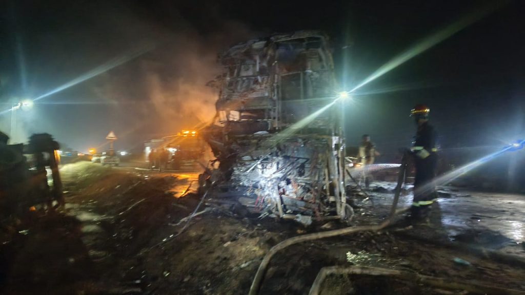 ప్రమాదానికి గురైన పూర్తిగా కాలిపోయిన ప్రైవేట్ ట్రావెల్స్ బస్సు.