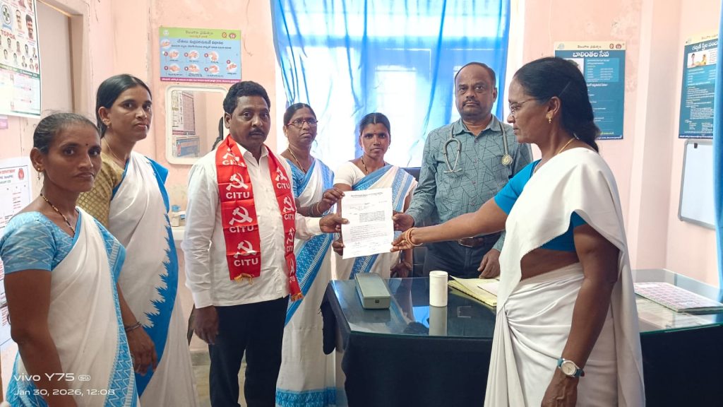ఫిబ్రవరి 12న జరగబోయే దేశవ్యాప్త సార్వత్రిక సమ్మెను జయప్రదం చేయాలని సిఐటియు జిల్లా అధ్యక్షుడు సి ఆర్ గోవింద్ రాజ్ కార్మిక వర్గానికి పిలుపునిచ్చారు. శుక్రవారం రోజు మక్తల్ మండల లోని కర్ని పి హెచ్ సి మెడికల్ అధికారి డాక్టర్ తిరుపతి కి సమ్మె నోటీస్ అందజేశారు ఈ సందర్భంగా ఆయన మాట్లాడుతూ కేంద్ర ప్రభుత్వం అనుసరిస్తున్న ఆర్థిక, పారిశ్రామిక విధానాల వల్ల ప్రజలు, కార్మిక వర్గం ఎదుర్కొంటున్న సమస్యలను చర్చించిన జాతీయ కార్మిక సంఘాలు, స్వతంత్ర ఫెడరేషన్ లు 2026 ఫిబ్రవరి 12 న ఒకరోజు దేశవ్యాప్త సమ్మెకు పిలుపునిచ్చాయని తెలిపారు. 29 కార్మిక చట్టాల స్థానంలో కేంద్ర ప్రభుత్వం తెచ్చిన నాలుగు లేబర్ కోడ్ లను అమల్లోకి తెస్తూ 2025 నవంబర్ 21న ఇచ్చిన నోటిఫికేషన్ రద్దు చేయాలని, విద్యుత్ సవరణ చట్టం 2025 ను ఉపసంహరించుకోవాలని, పేదలకు పని గ్యారంటీ కల్పిస్తున్న ఎంజీఎన్ఆర్ఈజీఏ చట్టాన్ని కొనసాగించాలని,పెరుగుతున్న నిత్యవసర వస్తువుల ధరలకు అనుగుణంగా వేతనాలు పెంచాలని తదితర డిమాండ్లతో కేంద్ర కార్మిక సంఘాల ఆధ్వర్యంలో దేశవ్యాప్త సార్వత్రిక సమ్మెను నిర్వహిస్తున్నామని తెలిపారు. కార్మిక వర్గ హక్కులపై నిరంతర దాడి కొనసాగించేందుకు తీసుకొస్తున్న ప్రజా ,కార్మిక వ్యతిరేక విధానాలకు వ్యతిరేకంగా జరిగే ఈ సమ్మెలో కార్మిక వర్గం అధిక సంఖ్యలో పాల్గొనాలని కోరారు.కేంద్ర బిజెపి తీసుకు వచ్చిన నాలుగు లేబర్ కోడ్ లకు వ్యతిరేకంగా,కనీస వేతనాలు అమలు చేయాలని, అంగన్వాడి, ఆశ, మున్సిపల్, వివో ఏ కాంట్రాక్టు అండ్ అవుట్ సోర్సింగ్ ఉద్యోగులను పర్మినెంట్ చేయాలని,ప్రభుత్వ రంగ సంస్థలను పరిరక్షించాలని, ప్రభుత్వ రంగ సంస్థలలో పెట్టుబడుల ఉపసంహరణ ఆపాలని జరగబోయే సార్వత్రిక సమ్మెలో జిల్లాలోని కార్మిక వర్గం అధిక సంఖ్యలో హాజరు కావాలని కోరారు.పార్లమెంటులో మంద బలంతో కార్పొరేట్ అనుకూల చట్టాలు తీసుకువస్తూ కార్మిక వర్గాన్ని దోపిడీ చేస్తామంటే చూస్తూ ఊరుకునేది లేదన్నారు.ఫిబ్రవరి 12న జరిగే దేశవ్యాప్త సార్వత్రిక సమ్మెకు అధికార యంత్రాంగం, యాజమాన్యాలు సహకరించాలని కోరారు.ఈ కార్యక్రమంలో పి హెచ్ సి అధ్యక్షురాలు గోవిందమ్మ, కార్యదర్శి అమీనా బేగం, ఉపాధ్యక్షులు యశోద, ఆశమ్మ, సావిత్రమ్మ, లక్ష్మి తదితరులు పాల్గొన్నారు