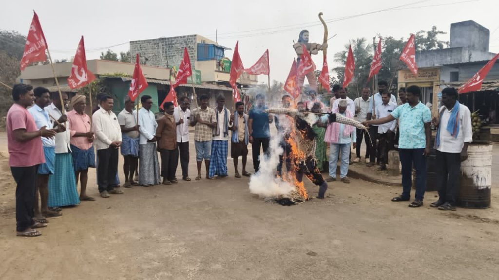 ఇల్లందు ;దురహంకార అమెరికా సామ్రాజ్యవాది, యుద్దోన్మాది ఆయన ట్రంప్ తో మోడీ ప్రభుత్వం ద్రోహపూరిత స్వేచ్ఛ వాణిజ్య ఒప్పందాలను విరమించుకోవాలని, నూతన విత్తన చట్టం రద్దు చేయాలని, విద్యుత్ చట్టాన్ని ఉపసంహరించుకోవాలని సిపిఐ ఎంఎల్ మాస్ లైన్ రాష్ట్ర కమిటీ బిజెపి ప్రభుత్వ దిష్టి బొమ్మలను గ్రామాలలో దగ్ధం చేయాలని పిలుపులో భాగంగా ఈ రోజు కొమరారం గ్రామంలో అల్లూరి సెంటర్లో బిజెపి కేంద్ర ప్రభుత్వ దిష్టి బొమ్మ దగ్ధం చేయడం జరిగింది. అనంతరం జరిగిన సభకు సిపిఐ ఎంఎల్ మాస్ లైన్ కొమరారం గ్రామ కార్యదర్శి కామ్రేడ్ వాంకుడోత్ శంకర్ అధ్యక్షత వహించగా రాష్ట్ర నాయకులు కామ్రేడ్ నాయిని రాజు డివిజన్ నాయకులు కొమరారం సర్పంచ్ అజ్మీరా బిచ్చ, పి డి యస్ యూ రాష్ట్ర అధ్యక్షులు కాంపాటి పృథ్వీ లు మాట్లాడుతూ కేంద్రంలోని బిజెపి ప్రభుత్వం నాలుగు లేబర్ కోడ్లు తీసుకువచ్చిదని ఈ లేబర్ కోడ్ ఇప్పుడున్న కార్మిక చట్టాలకు వ్యతిరేకంగా కనీసం దేశంలో ఉన్న కార్మికు వారి వేతనాలు పెంచాలని సభ్య చేసే హక్కులు కూడా వాళ్ళు కోల్పోతున్నారని అన్నారు.ఈ కార్యక్రమంలో శాతారావు ధారావత్ దేవా బాధావత్ రమేష్ కుంజ సమ్మన్న తనకాం సత్యం చొప్పదండి రాములన్న భయ్యా వెంకన్న కాంపాటి జగ్గులు కాంపాటి వెంకన్న ఇస్లావత్ కొటేష్ కాంపాటి ప్రసాద్.భుషణం DSP సత్యం సురేందర్ ఏలేందర్ కోరం ముతక్క బుర్రి పద్మ సమ్మెట యమున కుంజ కృష్ణ గూగులొత్ వినోద్ . ఇంకా తదితరులు పాల్గొన్నారు.