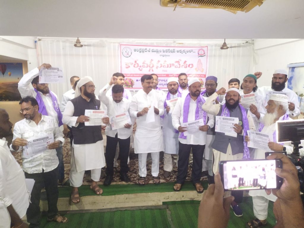 ఆంధ్రప్రదేశ్ ముస్లిం ఫెడరేషన్ రాష్ట్ర స్థాయి కార్యవర్గ సమావేశం కడప నగరంలోని షాహి దర్బార్ కన్వెన్షన్ హాల్లో గురువారం ఆంధ్రప్రదేశ్ ముస్లిమ్ ఫెడరేషన్ రాష్ట్ర కన్వీనర్ షేక్ దస్తగిరి ఆధ్వర్యంలో జరిగింది. ఈ కార్యక్రమానికి ముఖ్యఅతిథిగా పాల్గొన్న అంజాద్ భాష మాట్లాడుతూ కూటమి ప్రభుత్వం ముస్లింలకు ఇచ్చిన హామీలను ఒకటి కూడా నెరవేర్చలేదని అయన దుయ్యబడ్డారు. ముస్లింలకు అట్రాసిటీ చట్టం తీసుకురావాలి సబ్ ప్లాన్ ఏర్పాటు చేయాలి ఒక బోర్డుపై ఉన్న వ్యక్తిగత పాసుబుక్కులను రద్దు చేయాలి ముస్లిముల కొరకు ప్రత్యేక విశ్వవిద్యాలయాలను ఏర్పాటు చేసి అందులో 70 శాతం రిజర్వేషన్లు ముస్లింలకు కల్పించాలని ముస్లిం యువతకు ప్రతి జిల్లాలో స్కిల్ డెవలప్మెంట్ సెంటర్ ఏర్పాటు చేయాలని ముస్లింలపై పెట్టిన అక్రమ కేసులను వెంటనే ఎత్తివేయాలని ఉర్దూను ద్వితీయ భాషగా అమలు చేయాలని స్థానిక సంస్థల్లో ముస్లింలకు అడ్డంగా ఉన్న ఇద్దరు పిల్లల నిబంధన తొలగించాలని వీటి హక్కుల కొరకై అన్ని సంఘాలతో కలిసి ఎంతటి ఉద్యమానికైనా వెనకాడమని ఆయన తెలిపారు. మానవ హక్కుల సాధన కోసం రాజకీయ పార్టీలతోనూ సంబంధం లేకుండా ప్రతి వ్యక్తి ఎక్కడ ఉన్న ముస్లింలకు మేలు కలిగే విధంగా పాటుపడాలని ఆయన పిలుపునిచ్చారు. ఈ సందర్భంగా ఆంధ్రప్రదేశ్ ముస్లిం ఫెడరేషన్ రాష్ట్ర కన్వీనర్ షేక్ దస్తగిరి మాట్లాడుతూ. కూటమి ప్రభుత్వం ముస్లిములను ఇచ్చిన వాగ్దానాలు తుంగలో తొక్కి విస్తరించడం చాలా బాధాకరం. మరొక్కసారి చంద్రబాబు గారి చేతుల్లో ముస్లిం సమాజం మోసపోయింది. ఇచ్చిన వాగ్దానాలు అమలు చేయకుంటే భవిష్యత్తులో ఉద్యమాలను తీవ్రతరం చేస్తామని రాష్ట్రవ్యాప్తంగా ఉన్న సంఘాలను సొసైటీలను ట్రస్టులను ఏకం చేసి తీవ్రస్థాయిలో ఉద్యమిస్తామని తెలియజేయడం జరిగింది హెచ్చరించడం జరిగింది.ఈ కార్యక్రమంలో ఆళ్లగడ్డ జాయింట్ యాక్షన్ కమిటీ కన్వీనర్ బీరువాల భాష , జాకీర్ హుస్సేన్, రియాజ్, మహబూబ్ బాషా, డాక్టర్ ఇబ్రహీం, హరిచంద్ర, సోహెల్,కలీం, రవి, సాదిక్, షబ్బీర్, తదితర రాష్ట్ర నాయకులు పాల్గొన్నారు.