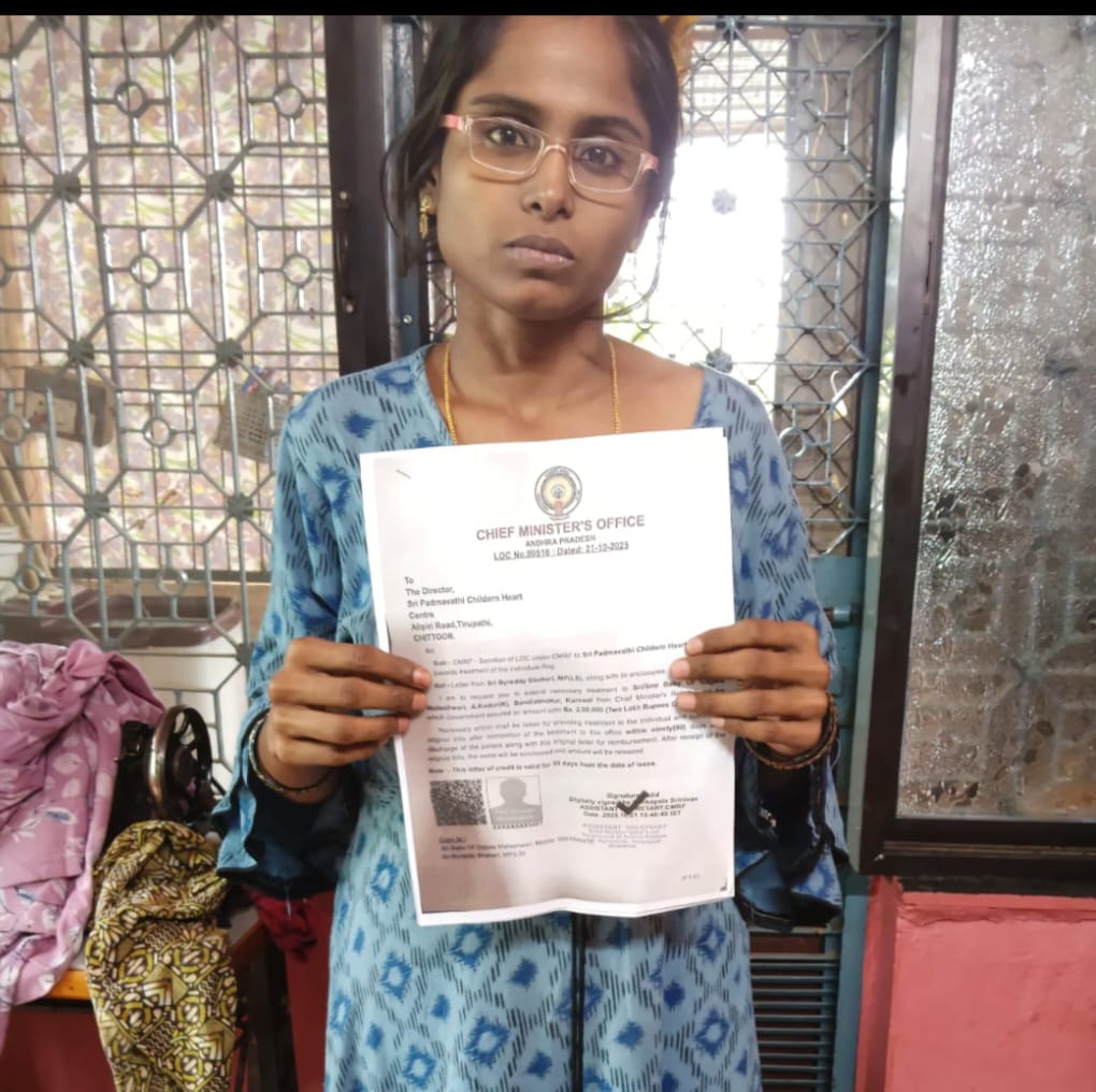 నంద్యాల జిల్లా శ్రీశైలం నియోజకవర్గం బండి ఆత్మకూరు మండలం ఏ కోడూరు గ్రామానికి చెందిన గజ్జెల మల్లేశ్వరి కుమారుడు 3 నెలల చిన్నారి ( భూమా యశ్వంత్ రెడ్డి ) కొద్ది రోజుల నుండి గుండె సంబంధిత వ్యాధితో బాధపడుతూ తిరుపతిలోని శ్రీ పద్మావతి చిల్డ్రన్ హార్ట్ సెంటర్ హాస్పిటల్ లో చికిత్స పొందుతున్నారు.తప్పనిసరిగా సర్జరీ (ఆపరేషన్) చేయాలని వైద్యులు చెప్పడంతో ఆర్థిక ఇబ్బందితో బాధపడుతున్న చిన్నారి తల్లి నంద్యాల ఎంపి డాక్టర్ బైరెడ్డి శబరికి ఫోన్ కాల్ చేసి విషయం చెప్పిన వెంటనే స్పందించిన నంద్యాల పార్లమెంట్ సభ్యురాలు, లోక్ సభ టీడీపీ డిప్యూటీ ఫ్లోర్ లీడర్ డాక్టర్ బైరెడ్డి శబరి LOC కోసం ఎంపీ లెటర్ ఇచ్చి విజయవాడలో సంబంధిత అధికారులతో ఎంపీ డాక్టర్ బైరెడ్డి శబరి మాట్లాడి అవసరమైన రెండు లక్షల రూపాయలను (2,00,000) గుండె ఆపరేషన్ కోసం మంజూరు చేయించడం జరిగింది.తమ బాధను అర్థం చేసుకొని ఆపరేషన్ కోసం LOC మంజూరు చేసిన రాష్ట్ర ముఖ్యమంత్రి నారా చంద్రబాబు నాయుడుకు , నంద్యాల ఎంపీ డాక్టర్ బైరెడ్డి శబరి కి గజ్జెల మల్లేశ్వరి కుటుంబ సభ్యులు కృతజ్ఞతలు తెలిపారు.