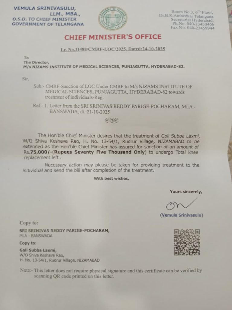 మోకాల శాస్త్ర చికిత్స కొరకు సీఎం నిధుల ద్వారా సహాయం..