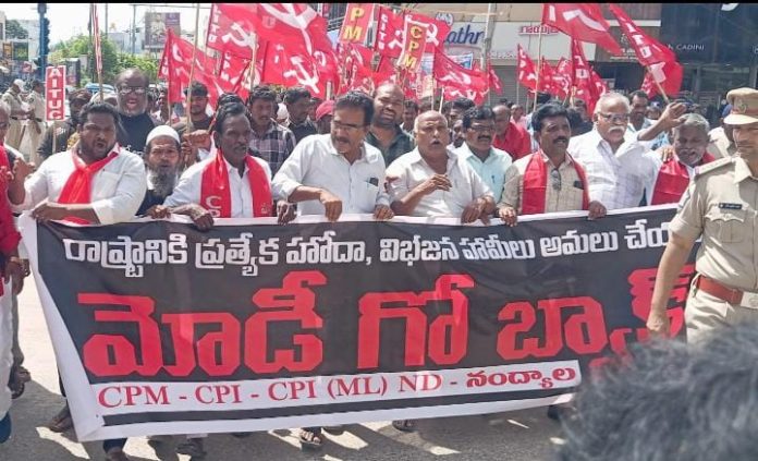 నంద్యాల పట్టణంలో సిపిఎం,సిపిఐ,సిపిఐ (ఎంఎల్) పార్టీల ఆధ్వర్యంలో మోడీ గో బ్యాక్ కార్యక్రమం బాగా సక్సెస్ అయింది, నరేంద్ర మోడీ ఉమ్మడి కర్నూలు జిల్లాకు వస్తున్న నేపథ్యంలో వామపక్ష పార్టీల ఆధ్వర్యంలో నిరసన కార్యక్రమం నిర్వహించారు.ఈ కార్యక్రమంలో 300 పైగా వామపక్ష పార్టీ కార్యకర్తలు పాల్గొన్నారు, రాష్ట్రానికి ప్రత్యేక హోదా విభజన హామీలు అమలు చేయకుండా మన జిల్లాకు రావడం చాలా బాధాకరం.జీఎస్టీ పేరు మీద ప్రజల యొక్క సొమ్ము 55 లక్షల కోట్లకు పైగా ఆదాని,అంబానీ లాంటి కార్పొరేట్లకు దోచి పెట్టాడు,కేవలం 48 వేల కోట్లు మాత్రమే జీఎస్టీ ద్వారా తగ్గించి, జిఎస్టిని తగ్గించి ప్రజలకు మేలు చేశారని గొప్పలు చెప్పుకుంటున్నారు.నరేంద్ర మోడీ గో బ్యాక్ అంటూ నినాదాలు చేశారు, ఇవే కాదు కడప ఉక్కు రాయలసీమ హక్కు అనే నినాదాన్ని కూడా తుంగలో తొక్కాడు, కడపకు స్టీల్ ప్లాంట్ ఇవ్వకుండా రాయలసీమకు మోసం చేశాడు.ఇలాంటివి మన రాష్ట్రానికి ఎన్నో వాగ్దానాలు చేసినా మోసకారి మోడీని మన యొక్క జిల్లాకు రావడం చాలా దౌర్భాగ్య పరిస్థితి,,ఈ యొక్క కూటమి ప్రభుత్వ నేతలకు సిగ్గు ఉండాలా కళ్ళముందే రాష్ట్రానికి ఇంత అన్యాయం జరుగుతుంటే ప్రజాధనాన్ని లూటీ చేసి లక్షల మంది జనాలను మోడీ బహిరంగ సభకు తోలడం చాలా బాధాకరము. కాబట్టి ఇప్పటికైనా కూటమి ప్రభుత్వం నేతలు అందరూ రాయలసీమకు రావలసిన వాగ్దానాలన్నింటినీ అమలు చేపించుకోవాల్సిందిగా వామపక్ష పార్టీలుగా కోరుతున్నాము, లేకుంటే ఆంధ్రప్రదేశ్ ద్రోహులుగా చరిత్రలో మీరు కూడా నిలబడతారు, తక్షణమే ఇచ్చిన వాగ్దానాలను అమలు చేయాలని వారు డిమాండ్ చేశారు,ఈ యొక్క కార్యక్రమంలో సిపిఎం, సిపిఐ,సిపిఐ (ఎంఎల్) నాయకులు పాల్గొనడం జరిగింది