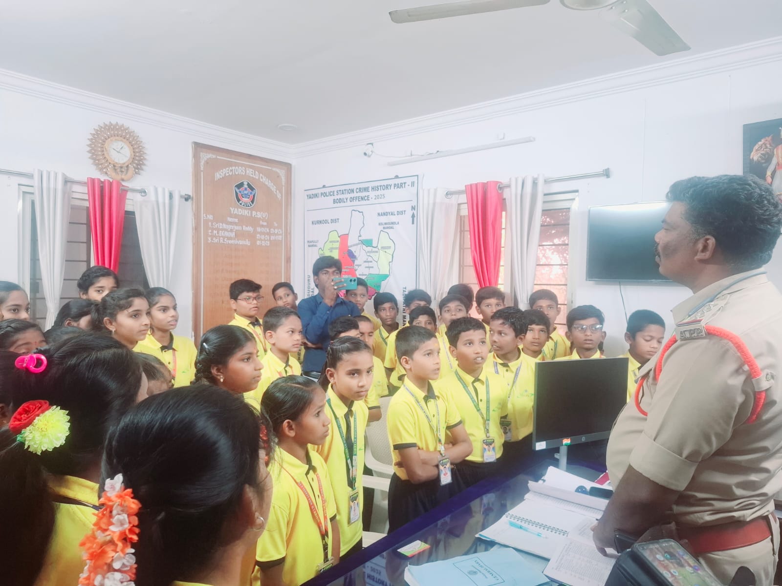 స్థానిక యాడికి పట్టణంలో విజన్ విద్యాసంస్థల విద్యార్థులు యాడికి సిఐ ఆర్ శ్రీనివాసులు గారితో ముఖాముఖి కార్యక్రమాన్ని నిర్వహించడం జరిగినది. ఈ కార్యక్రమంలో విజన్ విద్యార్థులు ఆర్ శ్రీనివాసులు గారిని ఎఫ్ఐఆర్ అంటే ఏమిటి, విద్యార్థులు తమరి స్థాయికి రావాలంటే ఏం చేయాలి, ఇక్కడ పోలీస్ స్టేషన్లో ఏ కార్యక్రమాలు నిర్వహిస్తారు, దొంగలను ఎలా పట్టుకుంటారు, విద్యార్థులు జీవితంలో ఎలా ఉండాలి అనే ప్రశ్నలకు సీఐ శ్రీనివాసులు గారు ఎంతో ఓపికగా చాలా చక్కగా వారికి సమాధానం చెప్పడం జరిగింది. విద్యార్థి దశ నుంచి ఒక లక్ష్యం ఏర్పాటు చేసుకోవాలని ప్రతి ఒక్కరు క్రమశిక్షణను కలిగి ఉండాలని ఎటువంటి చెడు అలవాట్లకు లోను కాకూడదని ఒక ప్రణాళిక బద్ధంగా జీవితాన్ని మలుచుకోవాలని తల్లిదండ్రులకు ఎలాంటి చెడ్డ పేరు తీసుకురాకూడదని జీవితంలో కష్టపడి మంచిగా చదువుకొని తల్లిదండ్రులకు ఉపాధ్యాయులకు గ్రామానికి మంచి పేరు తీసుకురావాలని ఆయన చాలా చక్కగా విద్యార్థులకు వివరించడం జరిగింది. అలాగే కేసు ఫైల్స్ గురించి చట్టాల గురించి కూడా విద్యార్థులకు వివరించడం జరిగింది . ఈ సందర్భంగా విజన్ కరస్పాండెంట్ విశ్వనాథ్ సర్కిల్ ఇన్స్పెక్టర్ శ్రీనివాస్ గారికి మీరు తమ విలువైన సమయాన్ని వెచ్చించి విద్యార్థులకు ఇంత చక్కగా వివరించినందుకు ప్రత్యేక ధన్యవాదాలు తెలుపుకుంటున్నామని చెప్పడం జరిగింది…