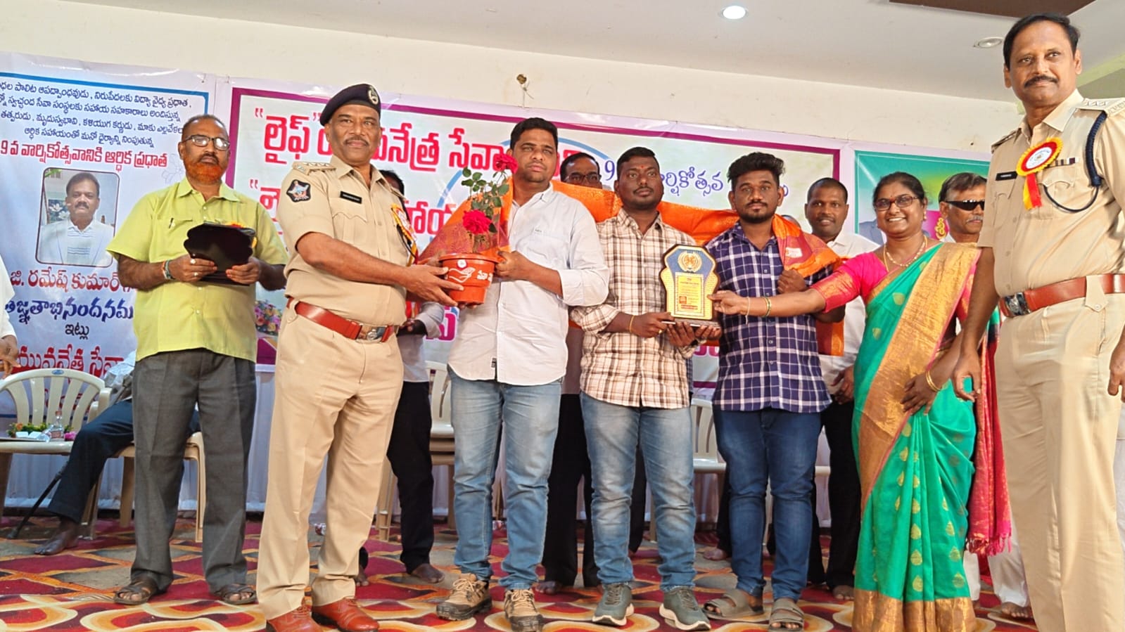 బనగానపల్లె పట్టణానికి చెందిన ఫ్రెండ్ బ్లడ్ గ్రూప్ ప్రతినిధి షాషావలి కు మరియు సభ్యులు రామకృష్ణ,మస్తాన్,మణి,వెంకట్ లకు ఉత్తమ ప్రతిభ అవార్డు అందుకున్నారు.గురువారం బేతంచెర్ల పట్టణంలోని అమ్మవారి శాలనందు లైఫ్ యువ నేత్ర సేవా సమితి 9వ వార్షికోత్సవం సందర్బంగా ఏర్పాటు చేసిన కార్యక్రమానికి ముఖ్య అతిథులుగా పర్యావరణ పరిరక్షకుడు స్పెషల్ పోలీస్ ఆఫ్ కర్నూలు డిఎస్పి మహబూబ్ బాషా,డోన్ డిఎస్పి శ్రీనివాసులు పాల్గొన్నారు.లైఫ్ యువ నేత్ర సేవా సమితి ఆధ్వర్యంలో ఫ్రెండ్స్ బ్లడ్ గ్రూప్ ప్రతినిధి షాషావలికి ఉత్తమ ప్రతినిధి ప్రశంసపత్రాన్ని డీఎస్పీలు మహబూబ్ బాషా,శ్రీనివాసులు మెమెంటో అందజేసి ఘనంగా సన్మానించారు.బాధితులకు ఏ సమయంలోనైనా రక్తం కావాలని ఫోన్ చేస్తే వెంటనే స్పందించి రక్తాన్ని అందించే ఫ్రెండ్స్ బ్లడ్ గ్రూప్ సంస్థను గుర్తించి అవార్డును ప్రశంస పత్రాన్ని అందజేశారు.ఈ సందర్భంగా షాషావలి మాట్లాడుతూ అవార్డు రావడం ద్వారా బాధ్యత మరింత పెరిగిందన్నారు.తనకు సహకరిస్తున్న తన మిత్రులకు కృతజ్ఞతలు తెలియజేస్తున్నానని,యువత బాధ్యతగా ప్రతి మూడు నెలలకు ఒకసారి రక్తదానం చేస్తే దేశంలో రక్త కొరత ఉండదని అన్నారు.తాను ఇప్పటికీ 25 సార్లు రక్తదానం చేశానని తెలిపారు.వేల మందికి ప్రత్యక్షంగా,పరోక్షంగా రక్తం అందించినట్లు తెలిపారు.ఈ కార్యక్రమంలో భారీగా స్వచ్ఛంద సంస్థల సభ్యులు పాల్గొన్నారు.