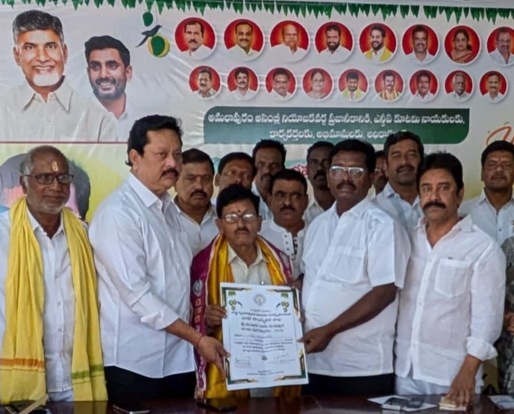 పయనించే సూర్యుడు మార్చి 21 ముమ్మిడివరం ప్రతినిధి: విజయవాడలో శ్రీ పరాభవ నామ సంవత్సర ఉగాది పర్వదినాన రాష్ట్ర ముఖ్యమంత్రి నారా చంద్రబాబు నాయుడు చేతుల మీదుగా సాహితీ రంగంలో రాష్ట్ర ప్రభుత్వ ఉగాది పురస్కారం పొందిన సీనియర్ తెలుగు లెక్చరర్,శ్రీ శ్రీ కళావేదిక జిల్లా అధ్యక్షులు,”నడకకవి” నల్లా నరసింహమూర్తిని ప్రపంచ కవిత దినోత్సవం సందర్భంగా శనివారం మధ్యాహ్నం అమలాపురం శాసనసభ్యులు అయితా బత్తుల ఆనందరావు, టిడిపి రాష్ట్ర కార్య నిర్వాహక కార్యదర్శి మెట్ల రమణ బాబు, అము డా చైర్మన్ అల్లా డ స్వామి నాయుడు, సన్మానించారు. నాలుగు దశాబ్దాలుగా తెలుగు భాషకు, ఆధునిక తెలుగు సాహిత్వాని కి చేస్తున్న నిరంతర సేవలను వారు ప్రశంసించారు. రాష్ట్ర ముఖ్య మంత్రి చంద్రబాబు నాయుడు చేతుల మీదుగా ఉగాది పురస్కారం తీసుకోవడం తనకు ఎంతో ఆనందంగా ఉందని ఈ సందర్భంగా పునస్కార గ్రహీత నరసింహమూర్తి అన్నారు. తనను ప్రోత్సహిస్తున్న శాసనసభ్యులు ఆనందరావు కు కృతజ్ఞతలు తెలిపారు. కవులను సాహిత్యాన్ని ప్రోత్సహిస్తూ ప్రతిభను వెలికి తీస్తున్న మీరు సమాజానికి స్ఫూర్తి దాయకులు అని కవి నరసింహమూర్తి శాసనసభ్యులను ప్రశంసించారు. కార్యక్రమంలో పెచ్చెట్టి విజయలక్ష్మి, కంకటాల రాంబాబు పాల్గొన్నారు.