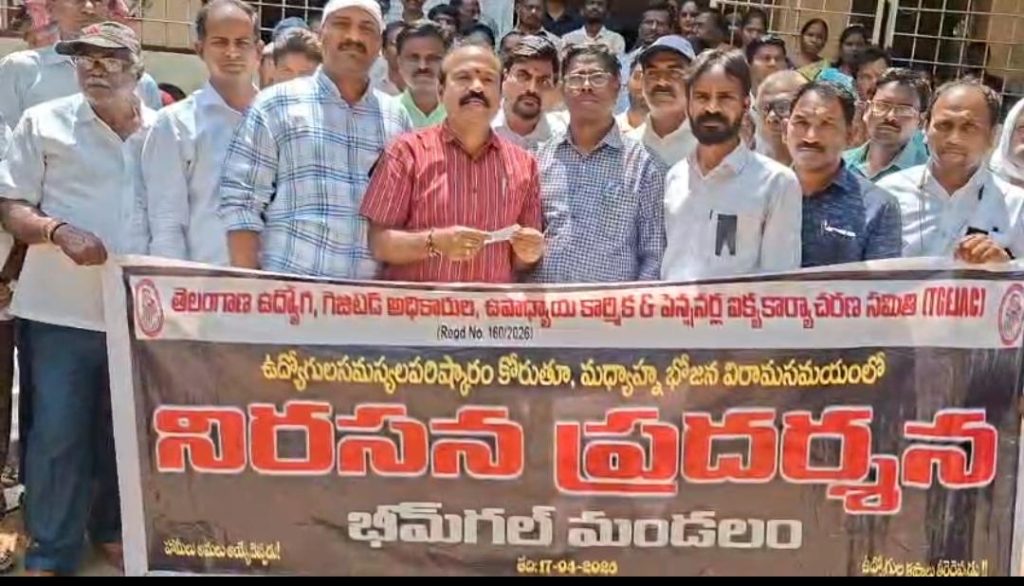 2, ఉద్యోగులకు చెల్లించాల్సిన పెండింగ్ బిల్లులు,రిటైర్డ్ ఉద్యోగుల బిల్లులు 13 వేల కోట్లు వెంటనే విడుదల చేసి ఏక మొత్తంలో చెల్లించాలి 3, గత చాలా కాలం నుండి ఉద్యోగులకు పెండింగ్ లో ఉన్న హెల్త్ కార్డులను వెంటనే అమలుపరచాలి 4,CPS కంట్రిబూషనల్ పెన్షనర్ స్కీమ్ ను రద్దు పరచి OPS ఓల్డ్ పెన్షన్ స్కీంను అమలుపర్చాలి పైన తెలిపిన నాలుగు ప్రధాన డిమాండ్లతో పాటు తెలంగాణ రాష్ట్ర ప్రభుత్వ ఉద్యోగులకు సంబంధించిన దీర్ఘకాలికంగా మిగిలియున్న 64 అంశాలను వెంటనే అమలుపరచాలి ఈ కార్యక్రమంలో TGO, ఎంపీడీఓ ల సంఘం రాష్ట్ర నాయకులు గంగుల సంతోష్ కుమార్, Dy తహసీల్దార్ శ్రీనివాస్, కమీషనర్ గంగాధర్ TNGO నాయకులు.సృజన్కుమార్,తిరుపతి, శ్రీనివాస్ PRTU మండలాధ్యక్షు డు ఎడ్ల శేఖర్,కార్యదర్శి కర్నాల శ్రీనివాస్ UTF బాధ్యాలు మల్లేష్, డిటిఎఫ్ బాధ్యులు జాన్విల్సన్, ఈశ్వర్ TPUS బాధ్యులు రమణ, భూమేశ్వర్, PGHM రమేష్ ,నాయకులు ప్రిన్స్, నరేష్, చంద్ర శేఖర్ తదితరులు పాలుగొన్నారు….