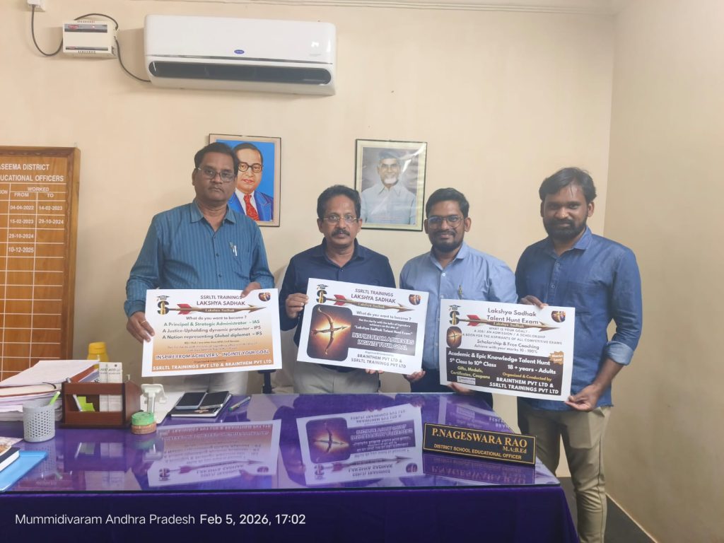 జిల్లా స్థాయిలో నిర్వహించే “లక్ష్యసాధక్” కార్యక్రమాన్ని ఆవిష్కరించిన గౌరవ కలెక్టర్ మరియు గౌరవ ఎస్ పి గారు. డాక్టర్ బి.ఆర్ అంబేద్కర్ కోనసీమ జిల్లా వ్యాప్తంగా అన్ని రకాల ఉద్యోగ పోటీ పరీక్షలకు సిద్ధమవుతున్న మరియు రాస్తున్న వారికి జిల్లావ్యాప్తంగా “లక్ష్యసాధక్ టాలెంట్ హంట్ ఎగ్జామ్” పోటీని ఉచితంగా నిర్వహిస్తున్నామని SSRLTL – CEO సాంబశివరావు పేర్కొన్నారు. అదే రోజు పరీక్ష రాసిన వారిని ఉద్దేశించి, యుపిఎస్సి లాంటి అత్యున్నత పరీక్షల్లో విజయం సాధించిన ఐఏఎస్, ఐపీఎస్ అలాగే గ్రూప్ 1, గ్రూప్ 2 ఆఫీసర్లు వారి యొక్క అమూల్యమైన ఇన్స్పిరేషన్ సందేశాన్ని అందించే కార్యక్రమం “ఇన్స్పైర్ ఫ్రం ఎచీవర్స్ – ఇగ్నైట్ యువర్ గోల్ ” అని తేలిపారు.ఈ కార్యక్రమాన్ని స్థానిక కలెక్టరేట్ నందు గౌరవ కలెక్టర్ మహేష్ కుమార్ గారు ఆవిష్కరించారు. ఆయన మాట్లాడుతూ లక్ష్యం ఎప్పుడు ఉన్నతంగా ఉండాలని అన్నారు.స్థానిక ఎస్పీ కార్యాలయం నందు గౌరవ ఎస్ పి రాహుల్ మీన గారు ఈ కార్యక్రమాన్ని ప్రారంభిస్తూ లక్ష్యసాధనలో వచ్చే అడ్డంకులను ధైర్యంతో ఎదుర్కోవాలనీ, ఇటువంటి కార్యక్రమాలు ధైర్యాన్ని నింపడానికి ఉపయోగపడతాయని అన్నారు. నిర్వాహకులను అభినందిస్తూ కార్యక్రమం విజయవంతం అవ్వాలని ఆకాంక్షించారు.ముమ్మిడివరం డీఈవో కార్యాలయం నందు DEO నాగేశ్వరరావు గారు మరియు డిసిసిబి సెక్రటరీ హనుమంతరావు గారు విద్యార్థుల్లో అవగాహనను, సరైన పోటీ తత్వాన్ని పెంచడమే కాకుండా మానసికంగా అభివృద్ధిపరిచే ఇటువంటి కార్యక్రమాలు అవసరమని తెలిపారు.ఫిబ్రవరి 22వ తేదీ ఆదివారం ఈ కార్యక్రమాల్లో స్థానిక అమలాపురం స్థానిక సివి రామన్ స్కూల్ వేదికగా నిర్వహిస్తున్నామని బ్రెయిన్దెమ్ సీఈవో శాంతి స్వరూప్ తెలిపారు. అదే రోజున రామాయణ భాగవత భగవద్గీత మ్యాథ్స్ సైన్స్ ఇంగ్లీష్ తెలుగు సబ్జెక్టుల నందు జిల్లావ్యాప్తంగా విద్యార్థులకు” ఎకడమిక్ అండ్ ఎపిక్ నాలెడ్జ్ టాలెంట్ హంట్ ” పోటీ పరీక్షలను నిర్వహిస్తున్నామని, దీనిని తిరిగి రాష్ట్రస్థాయిలో నిర్వహిస్తామని, మొదటి ద్వితీయ తృతీయ బహుమతులుగా 12 లాప్టాప్ లు అందిస్తున్నామని శాంతిస్వరూప్ తెలిపారు.వివరములకు 8919050676 నెంబర్ను సంప్రదించాలని కోరారు.