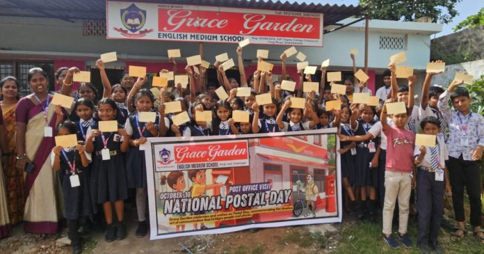 జాతీయ తపాలా దినోత్సవం సందర్భంగా ఇండియన్ మాంక్స్ గ్రేస్ గార్డెన్ ఇంగ్లీష్ మీడియం స్కూల్, షాద్నగర్ విద్యార్థులు స్థానిక తపాలా కార్యాలయాన్ని సందర్శించారు. ఈ సందర్శనలో విద్యార్థులు తపాలా విభాగం పనితీరు మరియు లేఖరచన ప్రాముఖ్యత గురించి అవగాహన పొందారు. ప్రతి విద్యార్థి తమ తల్లిదండ్రులకు ఒక హృదయపూర్వక లేఖ రాసి స్వయంగా తపాలా పెట్టెలో వేసి పంపించారు. ఈ సందర్భంగా షాద్నగర్ తపాలా కార్యాలయ సిబ్బంది విద్యార్థులను ఆత్మీయంగా స్వాగతించి, ఒక లేఖ ఎలా పంపబడుతుంది, ఎలా గమ్యస్థానానికి చేరుతుంది. అనే ప్రక్రియను వారికి వివరించారు.తపాలా అధికారి డి. ఎ. ఈశ్వర్ విద్యార్థులను ఉద్దేశించి మాట్లాడుతూ.. ఈ రోజుల్లో తపాలా శాఖ అనలాగ్ ప్రపంచం నుండి డిజిటల్ యుగానికి మార్పు దశలో ఉందని చెప్పారు. భారత తపాలా శాఖ గ్రామీణ భారతాన్ని ఆధునిక భారతదేశంతో కలిపే కీలక వంతెనగా వ్యవహరిస్తోందని ఆయన వివరించారు. విద్యార్థులకు మై స్టాంప్, సుకన్య సమృద్ధి యోజన, పీపీఎఫ్, ఎన్ఎస్సీ మరియు ఆర్డీ ఖాతాలు వంటి పథకాలను వివరించి, చిన్న వయసులోనే పొదుపు మరియు డబ్బు నిర్వహణ పాఠాలను నేర్చుకోవడం ఎంత ముఖ్యమో తెలిపారు.గ్రేస్ గార్డెన్ స్కూల్ ప్రతినిధి ఆశిష్ బాబు మాట్లాడుతూ… వేగంగా మారుతున్న డిజిటల్ యుగంలో సంప్రదాయ సమాచార పద్ధతులను అర్థం చేసుకోవడం ద్వారా ప్రస్తుతాన్ని లోతుగా తెలుసుకోవచ్చని అన్నారు. “భూతకాలాన్ని అర్థం చేసుకోవడం ప్రస్తుతాన్ని స్పష్టంగా గ్రహించడానికి, భవిష్యత్తు సమస్యలను పరిష్కరించడానికి దారి చూపుతుంది” అని ఆయన పేర్కొన్నారు. పాఠ్యపుస్తకాలకు అతీతంగా నిజజీవితాన్ని అర్థం చేసుకునే దిశగా విద్యార్థులకు ఈ సందర్శనం ఉపయుక్తమని కూడా అన్నారు.తపాలా సహాయకురాలు మౌనికా చౌహాన్, పోస్టుమెన్లు జమీల, హరికృష్ణ, విక్రమ్ రెడ్డి, సాయి కుమార్ మరియు అభిషేక్ విద్యార్థులతో మాట్లాడి తపాలా కార్యాలయ రోజువారీ పనితీరును లేఖల వర్గీకరణ నుండి ప్రజా సేవల నిర్వహణ వరకు చూపించారు.