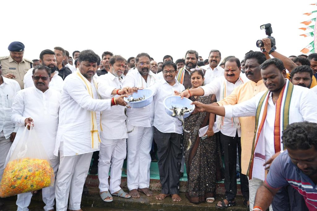 తెలంగాణ రాష్ట్ర ప్రభుత్వం మత్స్యశాఖ ఆధ్వర్యంలో వంద శాతం సబ్సిడీతో చేపట్టిన ఉచిత చేప పిల్లల పంపిణీలో భాగంగా రాష్ట్ర వైద్య ఆరోగ్య శాఖ, సాంకేతిక శాఖ, జిల్లా ఇంచార్జి మంత్రి దామోదర రాజనర్సింహ తో కలిసి పశుసంవర్ధక శాఖ, డైరీ డెవలప్మెంట్, యువజన క్రీడలు, మత్స్యశాఖ మంత్రి వాకిటి శ్రీహరి శుక్రవారం మక్తల్ మండలం సంగం బండ వద్ద గల చిట్టెం నర్సిరెడ్డి బ్యాలెన్సింగ్ రిజర్వాయర్, మక్తల్ పెద్ద చెరువులో చేపపిల్లలను విడుదల చేశారు. రాష్ట్రంలో మత్స్య సంపద ను పెంపొందించడమే లక్ష్యంగా ముందుకు సాగుతున్నట్లు ఈ సందర్భంగా మంత్రి వాకిటి శ్రీహరి తెలిపారు. అనంతరం రూ.370 లక్షల వ్యయంతో చేపట్టే మక్తల్ మినీ ట్యాంక్ బండ్ సుందరీకరణ పనులకు మంత్రులు శంకుస్థాపన చేశారు. ఈ కార్యక్రమంలో ఎమ్మెల్యేలు డాక్టర్ చిట్టెం పర్నికా రెడ్డి, మధుసూదన్ రెడ్డి, యెన్నం శ్రీనివాసరెడ్డి, ఈర్లపల్లి శంకర్, జిల్లా కలెక్టర్ సిక్తా పట్నాయక్, ఎస్పీ డాక్టర్ వినీత్, రాష్ట్ర మత్స్యశాఖ చైర్మన్ సాయి, రాష్ట్ర మత్స్యశాఖ డైరెక్టర్ నిఖిల,జిల్లా గ్రంథా లయ సంస్థల చైర్మన్ వార్ల విజయకుమార్ తదితరులు పాల్గొన్నారు.
