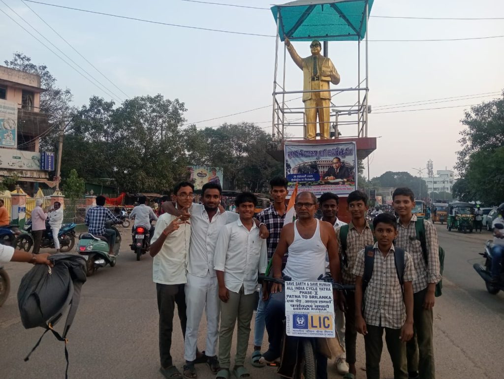 పాట్నా ఎల్ఐసి లో పనిచేస్తున్న దీపక్ కుమార్ మానవిళి భవాని భవిష్యత్తు మనుగడ శ్రేయస్సు కు ‘ సేవ్ ఏర్త్ సేవ్ వార్యమన్‌ ‘ నివాదం తో చేపట్టిన ఆల్ ఇండియా సైకిల్ యాత్ర సూళ్లూరుపేటకు చేరుకుంది కాలుష్యాన్ని తగ్గించడం శక్తిని ఆదా చేయటం స్థిరమైన వినియోగం చెట్లను నాటడం వంటి చర్యల ద్వారా మన గ్రహO జీవనా ధార వనరులు గాలి నీరు అడవులు జీవ వైవిధ్య0 రక్షించవచ్చని ఆయన అన్నారు ఇది భూమి మానవాళి భవిష్యత్త మనుగడ శ్రేయస్సుకు హమి ఇస్తుందన్నారు పాట్నా నుంచి శ్రీలంక వరకు ఈ సైకిల్ యాత్ర కొనసాగుతుందని తెలిపారు ఆయన సూళ్లూరుపేట వచ్చిన సందర్భంగా స్కూలు విద్యార్థులు కాలేజీ విద్యార్థులతో కాసేపు ముచ్చటించి తిరిగి ప్రయాణమై వెళ్లారు