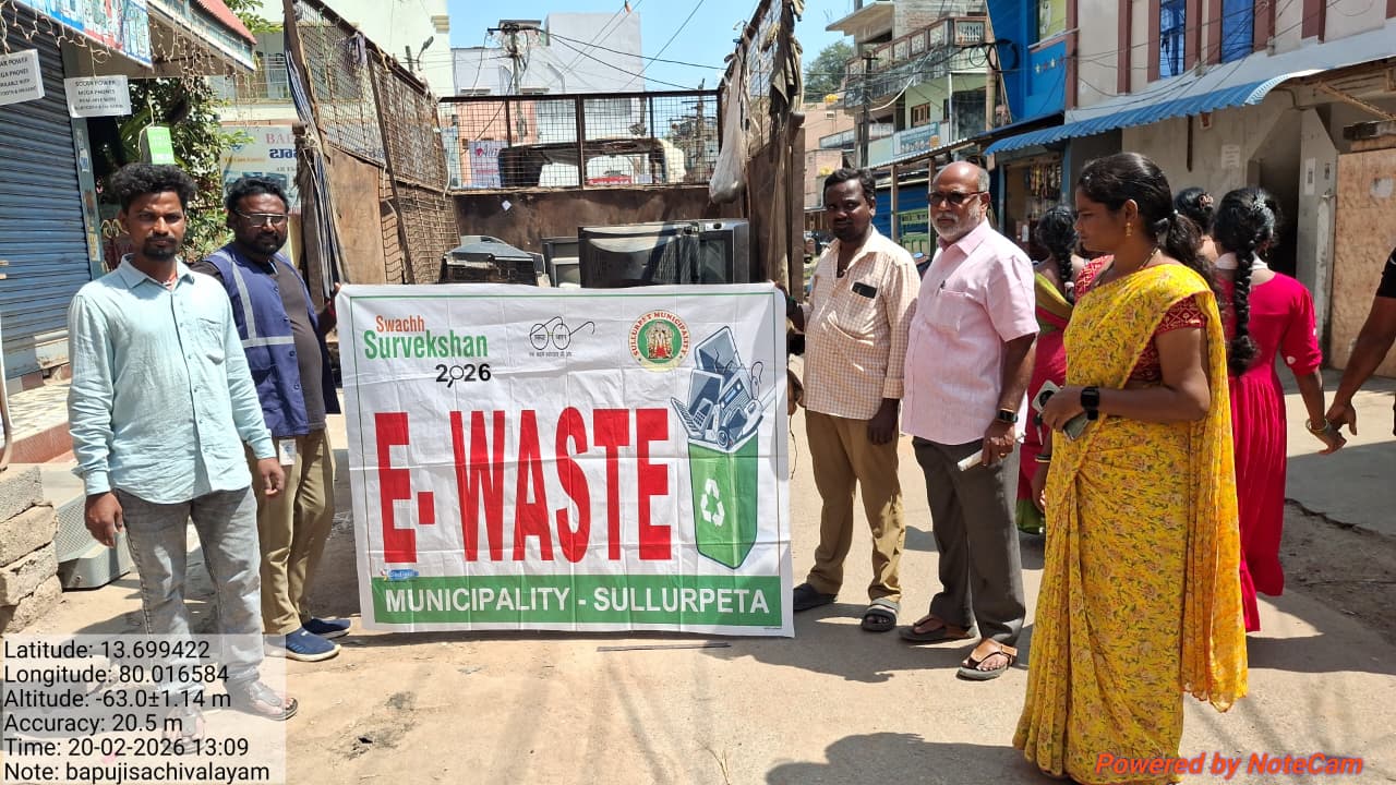 పయనించే సూర్యుడు ఫిబ్రవరి 21 (సూళ్లూరుపేట నియోజకవర్గం రిపోర్టర్ దాసు ) ఆంధ్రప్రదేశ్ రాష్ట్ర ప్రభుత్వం వారు ప్రతిష్టాత్మకాముగా చేపట్టిన స్వర్ణాంధ్ర స్వచ్చంద్ర (SASA) కార్యక్రమంలో భాగంగా ప్రతి నెల 10 మరియు 20 తారీఖు న E-వేస్ట్ సేకరణ జరుగుతుంది. సూళ్లూరుపేట పురపాలక సంఘం తేదీ: 20.02.2026 శుక్రవారం న సూళ్లూరుపేట మున్సిపల్ కమిషనర్ ఆధ్వర్యంలో ప్రత్యేక టీం అయినటువంటి e-వేస్ట్ నిర్వహణపై ప్రత్యేక కార్యక్రమం చేపట్టడం జరిగినది. ఇంటింటి నుండి పారిశుధ్య కార్మికుల ద్వారా దాదాపు 77 కిలోల e-వెస్ట్ సేకరించడమైనది. సేకరించిన E- వేస్ట్ ను రీసైక్లింగ్ కు పంపించడం జరుగుతుంది. వార్డు సచివాలయ సిబ్బంది, RP లు, SHG మెంబర్స్ ద్వారా e - వెస్ట్ నిర్వహణపై జరిగినది అటులనే పుర ప్రజలకు E- వేస్ట్ అనేవి చాలా ప్రమాదకరమైనవి అని అవగాహన కల్పించడం జరిగినది. సూళ్లూరుపేట పుర ప్రజలు ఇంకను E- వేస్ట్ ఉనచో మీ యొక్క సచివాలయం నందు గాని లేదా సూళ్లూరుపేట పురపాలక పారిశుధ్య కార్మికులకు గానీ అందించవలసినదిగా తెలియజేశారు. ఈ కార్యక్రమంలో మెప్మా సిబ్బంది, మునిసిపల్ సిబ్బంది మరియు సచివాలయ సిబ్బంది స్థానిక ప్రజలు పాల్గొన్నారు.