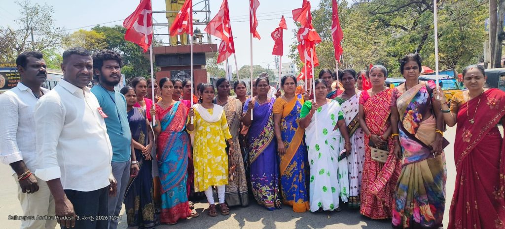 తిరుపతి జిల్లా సూళ్లూరుపేట మున్సిపాలిటీ పరిధిలో బస్టాండ్ సెంటర్లో ఉన్న అంబేద్కర్ విగ్రహం వద్ద సీఐ టీయూ నాయకుల ఆధ్వర్యంలో ఎర్రజెండాలు చేతపట్టి ఆశ వర్కర్లకు జరుగుతున్న అన్యాయం మీద మాకు న్యాయం చేయాలని ప్రభుత్వం దిగివచ్చి మాకు న్యాయం చేసేదాకా పోరాటం కొనసాగిస్తామని ఎర్రజెండాలతో నిరసన తెలియజేస్తున్నారు సీఐటీయూ మండల కార్యదర్శి లక్ష్మయ్య, సిఐటి యూ నాయకులు పద్మనాభం ఆధ్వర్యంలో కేంద్ర రాష్ట్ర ప్రభుత్వాలు కార్మిక వ్యతిరేక విధానాల పైన తీవ్ర ఆగ్రహం వ్యక్తం చేస్తున్నారు కనీస వేతనాలు పెంపు ఉద్యోగ భద్రత పెన్షన్ హక్కులు వంటివి డిమాండ్లను వెంటనే అమలు చేయాలని కోరారు సమస్య కోసం మా వాళ్లు విజయవాడలో పోరాటం చేస్తుంటే వచ్చిన వాళ్ళని కనీసం మర్యాద కూడా ఇవ్వకుండా బూటకపు అరెస్టులను ఖండిస్తూ సీఐటీ యూ నాయకులు తో కలిసి డాక్టర్ బి.ఆర్ అంబేద్కర్ సాక్షిగా నిరసన తెలియజేస్తున్నాం ఈ నిరసనకు స్పందించిన ఎడల రాష్ట్రంలో ఉన్న నాయకులు ఆశా వర్కర్స్ ముక్కుముడి నిరసన తెలియజేయాల్సి వస్తది ఈ కార్యక్రమంలో అంగనవాడి ఆశా వర్కర్స్ సుభాషిని , చెంగమ్మ. శశికళ, పుష్ప రాణి . తదితరులు పాల్గొన్నారు