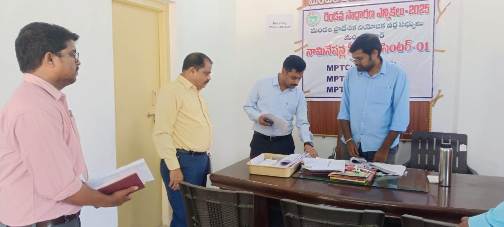 రుద్రూర్ మండల కేంద్రంలోని మండల కాంప్లెక్స్ భవనంలో ఏర్పాటు చేసిన RO, ARO డెస్క్ ల వద్ద జడ్పీటీసీ/ఎంపీటీసీ ఎన్నికల నామినేషన్ స్థానిక సంస్థల ఎన్నికల నియమావళిని గురువారం జిల్లా కలెక్టర్ వినయ్ కృష్ణా రెడ్డి పరిశీలించారు. నామినేషన్ లకు సంబంధించిన ప్రక్రియను పకడ్బందీగా చేపట్టాలని సంబంధిత అధికారులకు సూచించారు. కలెక్టర్ వెంట బోధన్ సబ్ కలెక్టర్ వికాస్ మహాతో, తహసీల్దార్ తారాబాయి, అధికారులు తదితరులు ఉన్నారు.
