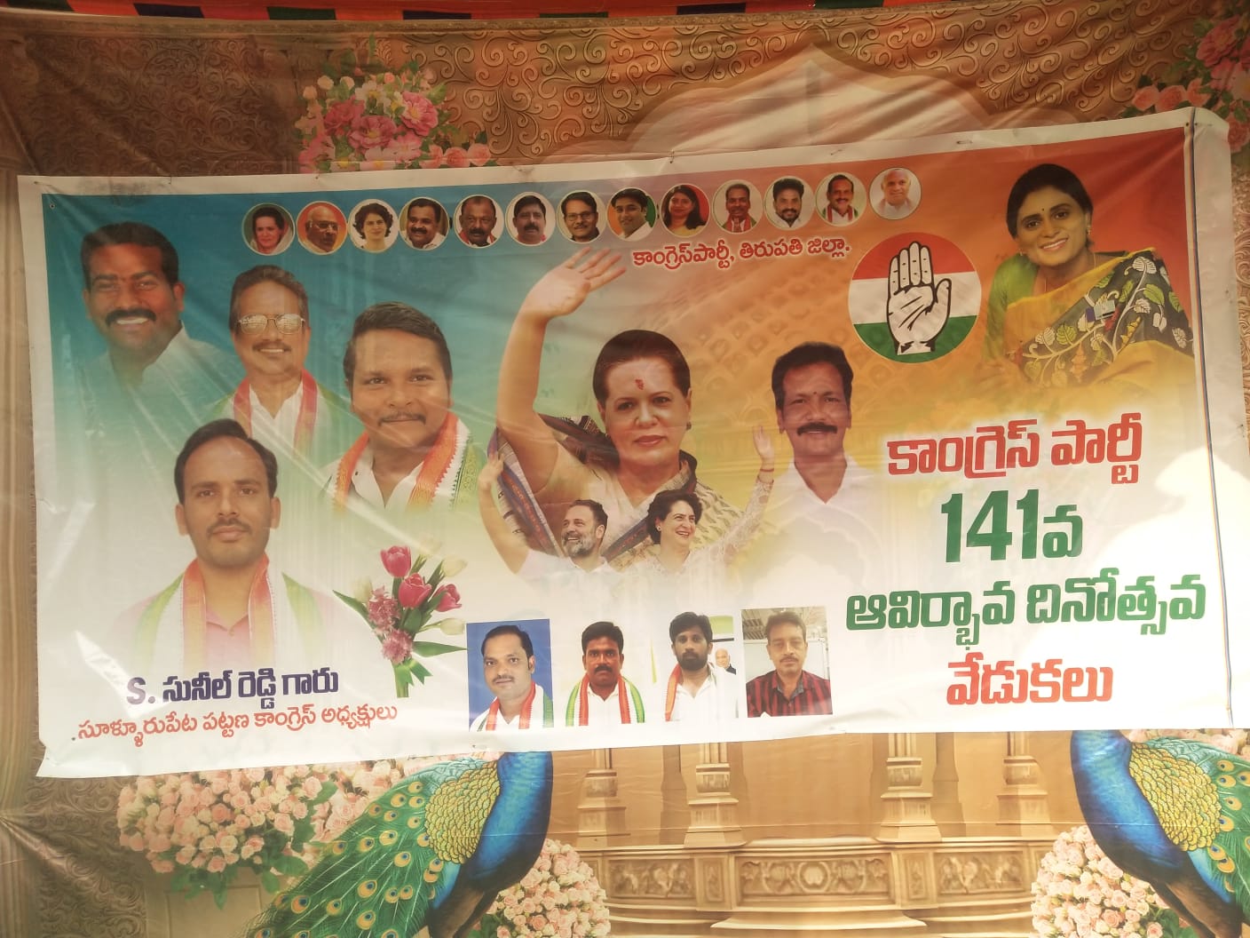 సూళ్లూరుపేట ఆర్టీసీ బస్టాండ్ ఆవరణంలో , 141 వ ఇండియన్ నేషనల్ కాంగ్రెస్ పార్టీ ఆవిర్భావ దినోత్సవ వేడుకల సందర్భంగా తిరుపతి జిల్లా, సూళ్లూరుపేట నియోజకవర్గ కార్యకర్తలు అభిమానులు, నాయకులతో, ఏ ఐ సి సి నాయకులు రాహుల్ గాంధీ, మరియు పి సి సి అధ్యక్షురాలు షర్మిల మేడం ఆదేశాలతో, డి సి సి బాలగూరవం బాబు ప్రేరణతో- సూళ్లూరుపేట కాంగ్రెస్ పార్టీ టౌన్ ప్రెసిడెంట్ యస్. సునీల్ రెడ్డి ఆధ్వర్యంలో తిరుపతిజిల్లా ఉపాధ్యక్షుడు దేవదానం తుమ్మ అధ్యక్షతన ఉత్సవ సభ ఏర్పాటు చేయడమైనది. ఈ సుభసందర్భమున కేక్ కట్ చేసి యావన్మందికి పంచిపెట్టడం జరిగింది.భారత దేశానికి, డాక్టర్ బి ఆర్ అంబేడ్కర్ అందించిన రాజ్యాంగంతో మొట్టమొదటిసారి ప్రజాస్వామ్య పాలనలో ప్రజలను నడిపించిన ఘనత కాంగ్రెస్ పార్టీది. ఆనాటి సంస్కరణలతోనే, ఆనాటి బహుళార్ధసాదక ప్రాజెక్ట్లతోనే ఈనాడుకూడా ఈ దేశం నడుస్తున్నదనడంలో అతిశయోక్తిలేదు. పేర్లు మార్చడం తప్పితే పేరుకొక్క ప్రాజెక్ట్ కూడా నిర్మించింది లేదు.ఆ తర్వాత ఇప్పటివరకు మరి ఏఇతర రాజకీయ పాలనలో ఏ ఒక్క ప్రాజెక్ట్ నిర్మించిన దాఖలాలు లేవు.అప్పటి ప్రయోజనకరమైన ప్రాజెక్ట్లే ఇప్పటికికూడా నడుస్తున్నాయంటే కాంగ్రెస్ పార్టీ పాలనావిధానము, సేవాతత్పరత గమనార్హము. ఆతర్వాత కుంటుబడిన అభివృద్ధికి, సమభావం, ప్రజాస్వామ్య శైలికి మళ్ళీ జవజీవాలు నింపాలంటే మళ్ళీ కాంగ్రెస్ పార్టీని బలోపేతం చేసి అధికారంలోకి తీసుకు రావాల్సిన అవసరం ఉందని పలువురు వక్తలు ప్రసంగించారు.ఈ కార్యక్రమంలో తిరుపతి జిల్లా మాజీ డిసిసి ప్రధాన కార్యదర్శి కన్నంబాకం హరికృష్ణ , సూళ్లూరుపేట టౌన్ వైస్ ప్రెసిడెంట్, యాసిన్ భాష, తడ మండలం అధ్యక్షులు భాస్కర్ రెడ్డి, తడ మండల ఓ బి సి చైర్మన్ CH. మహేంద్ర యాదవ్, తదితరులు పాల్గొని కార్యక్రమాన్ని జయప్రదం చేశారు.