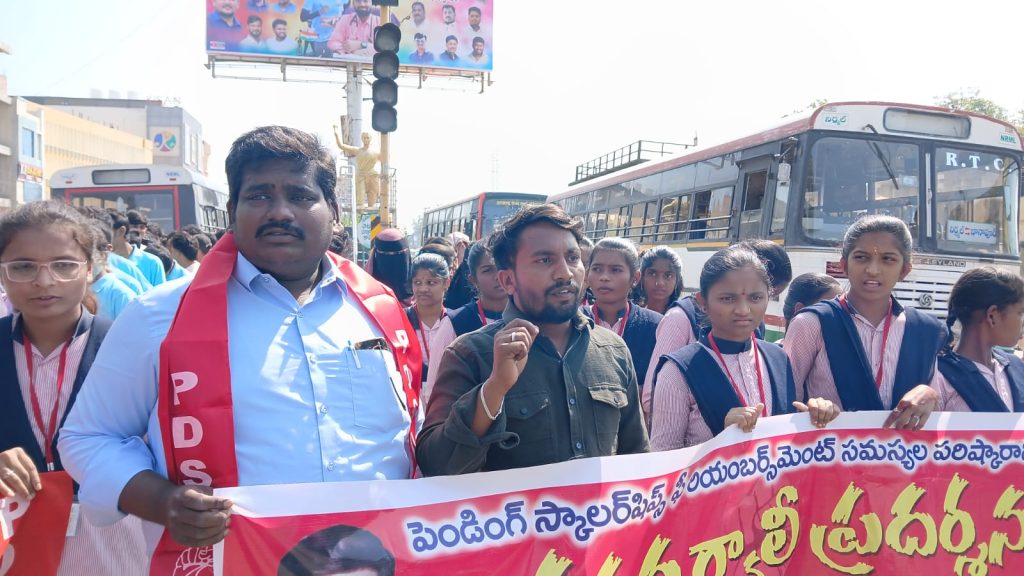 పెండింగ్ లో ఉన్న స్కాలర్షిప్, రియంబర్స్ బకాయిలను పూర్తి స్థాయిలో విడుదల చేయాలని డిమాండ్ చేస్తూ, ప్రగతిశీల ప్రజాస్వామ్య విద్యార్థి సంఘం (PDSU) ఆధ్వర్యంలో,బుధవారం డా”బిఆర్, అంబేద్కర్ చౌక్ నుండి వివేకానంద చౌక్ వరకు 200 మంది విద్యార్థులతో నిరసన ర్యాలి, ప్రదర్శన చేపట్టారు.ఈ సoధర్భంగా PDSU జిల్లా అధ్యక్షులు వి.మహేందర్ మాట్లాడుతూ…తెలంగాణ రాష్ట్రంలో గత నాలుగు సంవత్సరాలుగా దాదాపుగా 8-9 వేల కోట్ల రూపాయల స్కాలర్షిప్, ఫీజు రీయింబర్స్ మెంట్ బకాయిలు పెండింగ్లో ఉన్నాయని తెలిపారు .