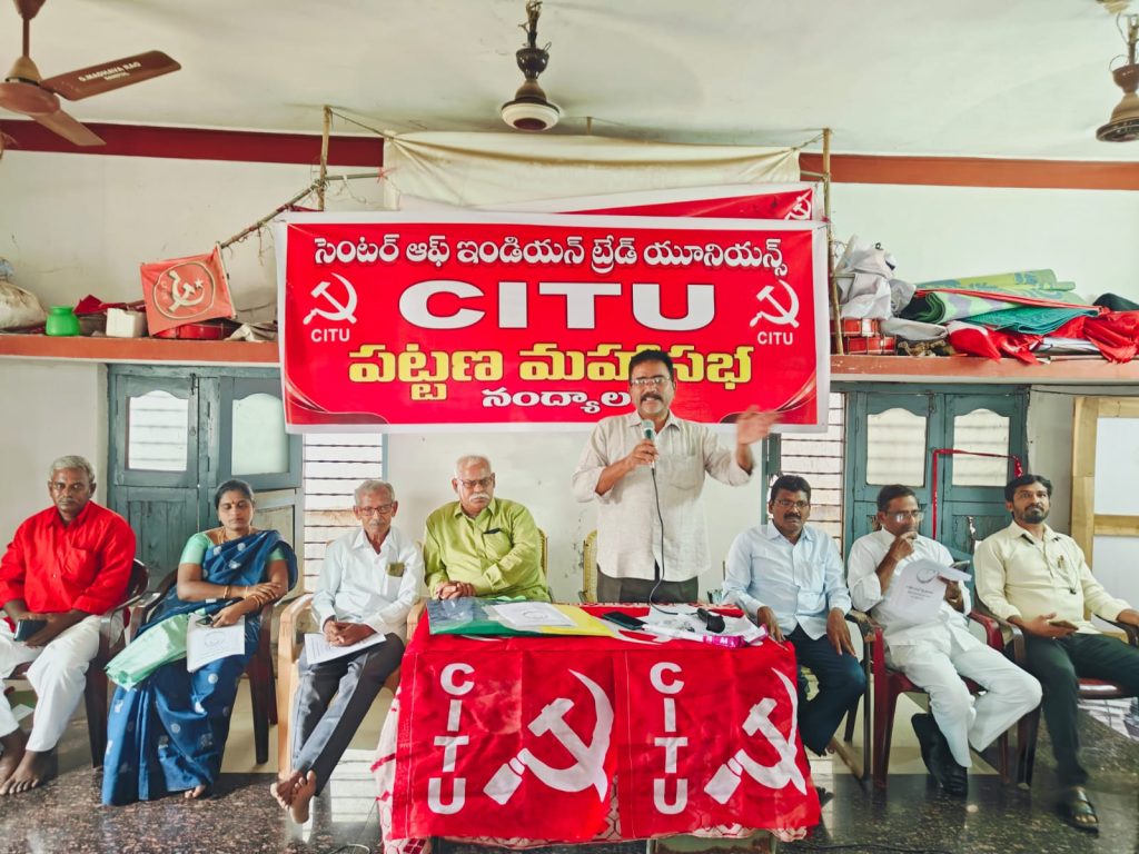 కేంద్రంలోని బీజేపీ ప్రభుత్వం గత 11 సంవత్సరాల కాలంలో పెట్టుబడిదారులకు కార్పొరేషన్ ఊడిగం చేస్తూ కార్మికులను నయా బానిసలుగా చేస్తూ ఉందని కార్మిక వర్గం చైతన్యమై పెట్టుబడిదారీ సమాజానికి ముగింపు పలకాలని కార్మిక రాజ్య స్థాపనకై ప్రతి ఒక్క కృషి చేయాలని సిఐటియు జిల్లా ప్రధాన కార్యదర్శి ఏ నాగరాజు అన్నారు.స్థానిక సిఐటియు కార్యాలయం నందు సిఐటియు పట్టణ మహాసభ సిఐటి అధ్యక్షులు లక్ష్మణ్ అధ్యక్షత న జరిగింది ఈ కార్యక్రమంలో సిఐటియు జిల్లా అధ్యక్షులు వి. ఏసురత్నం, జిల్లా ఉపాధ్యక్షులు తోట మద్దులు, సిఐటియు పట్టణ కార్యదర్శి కే మహమ్మద్ గౌస్, సిఐటియు సీనియర్ నాయకులు శ్రీనివాసమూర్తి, సిఐటియు పట్టణ ఉపాధ్యక్షులు నరసింహులు సునీత, సుజాత, శివమ్మ లతోపాటు హమాలీ యూనియన్ నాయకులు, కార్యకర్తలు వందమందికి పైగా పాల్గొనడం జరిగింది. ముందుగా పట్టణ మహాసభ ప్రారంభానికి ముందుగా సిఐటియు జెండాను సిఐటియు సీనియర్ నాయకులు, ఉపాధ్యక్షులు తోట మద్దులు ఎగరవేయడం జరిగింది. అనంతరం సిఐటియు జిల్లా ప్రధాన కార్యదర్శి నాగరాజు మాట్లాడుతూ గత 11 సంవత్సరాల కాలంలో కేంద్రంలోని నరేంద్ర మోడీ ప్రభుత్వం పెట్టుబడిదారులకు కార్పొరేట్ సంస్థలకు ఊడిగం చేస్తూ కార్మికులకు బ్రిటిష్ కాలం నాటి నుండి ఉన్న 44 కార్మిక చట్టాలను కుదింపు చేసి నాలుగు సివిల్ కోడ్ లుగా చేసి కార్మికులను నయా బానిసలుగా చేయాలని పరిశ్రమల లో యాజమాన్యాలు చెప్పింది వినాలి ఇచ్చిందే తీసుకోవాలి సమ్మె చేసే హక్కు అడిగి హక్కు లేకుండా చేస్తుందని దీనికి వ్యతిరేకంగా దేశవ్యాప్తంగా జూలైలో జరిగిన సమ్మెలో 30 కోట్ల మంది కార్మికుల పాల్గొని మోడీ ప్రభుత్వానికి హెచ్చరిక పంపడం జరిగిందని కార్మికుల జోలికి వస్తే సహించేది లేదన్న సంకేతాన్ని హెచ్చరికను కార్మిక లు సమ్మె రూపంలో తెలియజేసినారని ప్రభుత్వం కార్మికుల కు సంబంధించిన వ్యతిరేక విధానాలను అవలంబించాలంటే భయపడే పరిస్థితిలో ఉందని అన్నారు అదేవిధంగా ప్రభుత్వ రంగ సంస్థల ప్రైవేటు కన్నా వేగంగా చేసి ప్రజలకు ప్రభుత్వ రంగ సంస్థల ద్వారా అందించాల్సిన సేవను దూరం చేయడం జరుగుతుందని అక్కడ పనిచేసే ఉద్యోగులకు ఉద్యోగ భద్రత లేకుండా పోతుందని ఇప్పటికే ప్రభుత్వ శాఖల్లో ఉన్న ఖాళీ పోస్టులను భర్తీ చేయడం లేదని స్కీం వర్కర్లకు కనీస వేతనం 22 వేల రూపాయలు ఇవ్వాలని ప్రభుత్వ ఉద్యోగులుగా గుర్తించాలని రిటైర్మెంట్ బెనిఫిట్స్ సౌకర్యాలు కల్పించాలని ఆందోళనలు చేస్తున్న ప్రభుత్వం సమస్యలను పరిష్కారానికి చూపడం లేదని అన్నారు ఆంధ్రప్రదేశ్లో ఉన్న కూటమి ప్రభుత్వం ఎనిమిది గంటల పని విధానాన్ని రద్దు చేస్తూ 13:15 పని విధానాన్ని అమలుకు అసెంబ్లీలో ప్రవేశపెట్టడం చాలా దుర్మార్గమని కార్మికులను రోబోలుగా పని చే