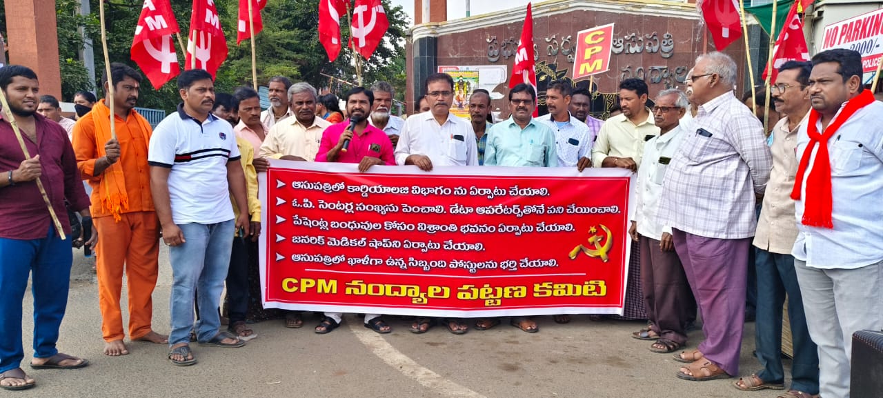 నంద్యాల జిల్లా ఏర్పాటైన నాటి నుండి నేటి వరకు నంద్యాల పట్టణంలోని జిల్లా జనరల్ ఆసుపత్రిలో సమస్యలు విలయతాండవం చేస్తున్న పరిష్కారానికి రాష్ట్ర ప్రభుత్వం కృషి చేయడం లేదని వెంటనే రోగుల సమస్యలను పరిష్కారం చేయాలని కోరుతూ సిపిఎం పట్టణ కమిటీ ఆధ్వర్యంలో ఆసుపత్రి ఎదుట నిరసన కార్యక్రమం తెలియజేయడం జరిగింది. ఈ కార్యక్రమానికి సిపిఎం పట్టణ కార్యదర్శి వర్గ సభ్యులు పుల్లా నరసింహులు అధ్యక్షత వహించగా ఈ కార్యక్రమంలో సిపిఎం జిల్లా కార్యదర్శి వర్గ సభ్యులు ఏ నాగరాజు వి ఏసురత్నం పట్టణ కార్యదర్శి లక్ష్మణ్,పట్టణ కార్యదర్శి వర్గ సభ్యులు కే మహమ్మద్ గౌస్, పి వెంకట లింగం,మౌలాలి పట్టణ కమిటీ సభ్యులు జైలాన్ లతోపాటు సత్యం, కేశాలు,నాగేంద్ర, రవి, రాణా, హుసేని, గోరెభాష లతో పాటు మరో 50 మంది పార్టీ కార్యకర్తలు పాల్గొనడం జరిగింది.అనంతరం సిపిఎం జిల్లా కార్యదర్శి వర్గ సభ్యులు ఏ.నాగరాజు, యేసురత్నం, పట్టణ కార్యదర్శి లక్ష్మణ్ లు మాట్లాడుతూ నంద్యాల జిల్లా అయినా తర్వాత అన్ని ప్రాంతాల నుండి వేలాదిమంది రోగులు నిత్యం వస్తున్నారని వారికి సరిపడే విధంగా ఓపి సెంటర్లు లేవని ఓపి సెంటర్ల సంఖ్యను వెంటనే పెంచాలని,డేటా ఆపరేటర్లతో పని చేయించాలని, అదేవిధంగా మారుతున్న పరిస్థితులలో గుండె జబ్బులు ఎక్కువ అవుతున్నాయని, రోగులు ప్రైవేట్ ఆస్పత్రులకు వెళ్లలేక సరైన సమయాలలో డబ్బులు లేక చనిపోవడం జరుగుతుందని, వెంటనే కార్డియాలజీ విభాగం ను ఏర్పాటు చేయాలని, ఆస్పత్రిలో అన్ని రకాల మందులు సరిపడా లేవని రోగులకు, ప్రజలకు అందుబాటులోకి 24 గంటలు తీసుకువచ్చేలా జనరిక్ మందుల షాప్ ఏర్పాటు చేయాలని,రాష్ట్ర ముఖ్యమంత్రి చంద్రబాబునాయుడు చెప్పిన విధంగా గర్భిణి లను నార్మల్ డెలివరీ చేసే విధంగా చర్యలు చేపట్టాలని, నంద్యాల కు మెడికల్ కాలేజీ ఏర్పాటైన తర్వాత కూడా ఆసుపత్రిలో రోగుల సంఖ్య కు అనుగుణంగా సిబ్బంది నియామకాలు చేపట్టలేదని, వెంటనే ఖాళీగా ఉన్న సిబ్బంది నియామకాలను చేపట్టాలని, ఆసుపత్రికి రోగులను చూసేందుకు బంధువులు వందలాదిమంది వస్తున్నారని ఇక్కడ భోజనం చేసుకునేందుకు, విశ్రాంతి తీసుకునేందుకు సరిపడా వసతి సదుపాయాలను ఏర్పాటు చేయాలని డిమాండ్ చేశారు. ఈ సమస్యలను పరిష్కారం చేయాలని లేకుంటే సిపిఎం పార్టీగా దశలవారీగా ఆందోళనలు ఉదృతం చేస్తామని హెచ్చరించారు.అనంతరం వినతిపత్రం అందించేందుకు వెళ్లగా ఆస్పత్రి సూపరిండెంట్ లేకపోవడంతో అక్కడ ఉన్న ఆర్ఎంవో వెంకటేశ్వర్లు సిపిఎం నాయకత్వం సంప్రదించగా నాకు సంబంధం లేదు. నేను ఏ వినతిపత్రం తీసుకోను, నేను రాను నాకు ఎవరేమైపోయిన నాకేమీ అవసరం లేదు అంటూ నిర్లక్ష్యంగా ఫోన్లో నిమిషాల తరబడి మాట్లాడడానికి సమయం కేటాయించుకోవడం చాలా దుర్మార్గంగా ఉందని అటువంటి 