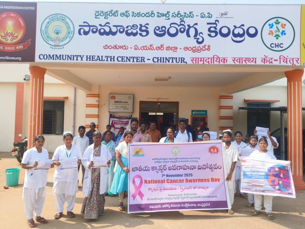 దేశవ్యాప్తంగా ప్రసిద్ధి చెందిన దేశభక్తి గీతం “వందేమాతరం” 150 సంవత్సరాల జ్ఞాపకార్థం జరుగుతున్న వేడుకల్లో భాగంగా, ఈరోజు చింతూరులోని కమ్యూనిటీ హెల్త్ సెంటర్ (CHC)లో ఒక ప్రత్యేక కార్యక్రమం నిర్వహించబడింది. 1875లో బంకిం చంద్ర ఛటర్జీ రాసిన వందేమాతరం చారిత్రక మరియు సాంస్కృతిక ప్రాముఖ్యతను గౌరవించడం ఈ కార్యక్రమం లక్ష్యం, ఇది మాతృభూమి పట్ల భక్తి మరియు ప్రేమ సందేశంతో తరతరాలను ప్రేరేపించింది.వైద్య అధికారులు, స్టాఫ్ నర్సులు, ఆరోగ్య కార్యకర్తలు మరియు స్థానిక సమాజ సభ్యులు ఈ వేడుకలో ఉత్సాహంగా పాల్గొన్నారు. ఈ కార్యక్రమం “వందేమాతరం” ఆలపించడంతో ప్రారంభమైంది, ఆ తర్వాత దాని చారిత్రక ప్రాముఖ్యతను మరియు భారత స్వాతంత్ర్య పోరాటంలో దాని పాత్రను హైలైట్ చేస్తూ సంక్షిప్త ప్రసంగాలు జరిగాయి.అలాగే జాతీయ క్యాన్సర్ అవగాహన దినోత్సవాన్ని కార్యక్రమంలో క్యాన్సర్‌ను ముందస్తుగా గుర్తించడం, నివారణ మరియు నిర్వహణ గురించి ప్రజలకు అవగాహన కల్పించే లక్ష్యంతో నిర్వహించింది. నివారించడంలో క్రమం తప్పకుండా ఆరోగ్య పరీక్షలు మరియు జీవనశైలి మార్పుల ప్రాముఖ్యతను ఎత్తి చూపారు. స్క్రీనింగ్ ద్వారా ముందస్తుగా గుర్తించడం వల్ల చికిత్స ఫలితాలు గణనీయంగా మెరుగుపడతాయని చెప్పారు.ANMలు, ASHAలు మరియు ఇతర ఫ్రంట్‌లైన్ ఆరోగ్య కార్యకర్తలు సమాజంలో అవగాహనను వ్యాప్తి చేయడంలో పాల్గొన్నారు. క్యాన్సర్ హెచ్చరిక సంకేతాలు, పొగాకు మానేయడం, ఆరోగ్యకరమైన ఆహారం మరియు మద్యం మరియు ఇతర క్యాన్సర్ కారక పదార్థాలను నివారించడం యొక్క ప్రాముఖ్యత గురించి ప్రజలకు అవగాహన కల్పించడానికి పోస్టర్లు మరియు కరపత్రాలు పంపిణీ చేయబడ్డాయి.సమాజం అంతటా అవగాహన వ్యాప్తి చేయడం మరియు క్యాన్సర్ నివారణ కొనసాగించాలని ప్రతిజ్ఞ చేసి ర్యాలీతో ఈ కార్యక్రమం ముగిసింది.