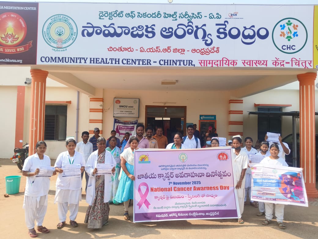 దేశవ్యాప్తంగా ప్రసిద్ధి చెందిన దేశభక్తి గీతం “వందేమాతరం” 150 సంవత్సరాల జ్ఞాపకార్థం జరుగుతున్న వేడుకల్లో భాగంగా, ఈరోజు చింతూరులోని కమ్యూనిటీ హెల్త్ సెంటర్ (CHC)లో ఒక ప్రత్యేక కార్యక్రమం నిర్వహించబడింది. 1875లో బంకిం చంద్ర ఛటర్జీ రాసిన వందేమాతరం చారిత్రక మరియు సాంస్కృతిక ప్రాముఖ్యతను గౌరవించడం ఈ కార్యక్రమం లక్ష్యం, ఇది మాతృభూమి పట్ల భక్తి మరియు ప్రేమ సందేశంతో తరతరాలను ప్రేరేపించింది.వైద్య అధికారులు, స్టాఫ్ నర్సులు, ఆరోగ్య కార్యకర్తలు మరియు స్థానిక సమాజ సభ్యులు ఈ వేడుకలో ఉత్సాహంగా పాల్గొన్నారు. ఈ కార్యక్రమం "వందేమాతరం" ఆలపించడంతో ప్రారంభమైంది, ఆ తర్వాత దాని చారిత్రక ప్రాముఖ్యతను మరియు భారత స్వాతంత్ర్య పోరాటంలో దాని పాత్రను హైలైట్ చేస్తూ సంక్షిప్త ప్రసంగాలు జరిగాయి.అలాగే జాతీయ క్యాన్సర్ అవగాహన దినోత్సవాన్ని కార్యక్రమంలో క్యాన్సర్ను ముందస్తుగా గుర్తించడం, నివారణ మరియు నిర్వహణ గురించి ప్రజలకు అవగాహన కల్పించే లక్ష్యంతో నిర్వహించింది. నివారించడంలో క్రమం తప్పకుండా ఆరోగ్య పరీక్షలు మరియు జీవనశైలి మార్పుల ప్రాముఖ్యతను ఎత్తి చూపారు. స్క్రీనింగ్ ద్వారా ముందస్తుగా గుర్తించడం వల్ల చికిత్స ఫలితాలు గణనీయంగా మెరుగుపడతాయని చెప్పారు.ANMలు, ASHAలు మరియు ఇతర ఫ్రంట్లైన్ ఆరోగ్య కార్యకర్తలు సమాజంలో అవగాహనను వ్యాప్తి చేయడంలో పాల్గొన్నారు. క్యాన్సర్ హెచ్చరిక సంకేతాలు, పొగాకు మానేయడం, ఆరోగ్యకరమైన ఆహారం మరియు మద్యం మరియు ఇతర క్యాన్సర్ కారక పదార్థాలను నివారించడం యొక్క ప్రాముఖ్యత గురించి ప్రజలకు అవగాహన కల్పించడానికి పోస్టర్లు మరియు కరపత్రాలు పంపిణీ చేయబడ్డాయి.సమాజం అంతటా అవగాహన వ్యాప్తి చేయడం మరియు క్యాన్సర్ నివారణ కొనసాగించాలని ప్రతిజ్ఞ చేసి ర్యాలీతో ఈ కార్యక్రమం ముగిసింది.